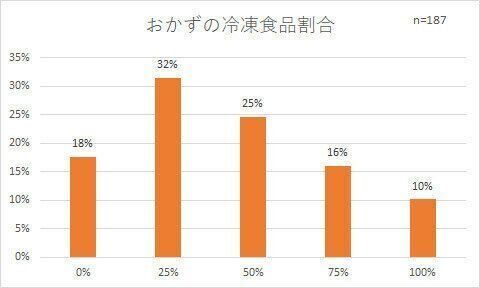 冷凍食品のおかずの割合は、4分の1くらいが最も多く32%、次いでおかずの半分が冷凍食品と回答した人が25%。おかずのほぼ全部が冷凍食品という人も1割いました。