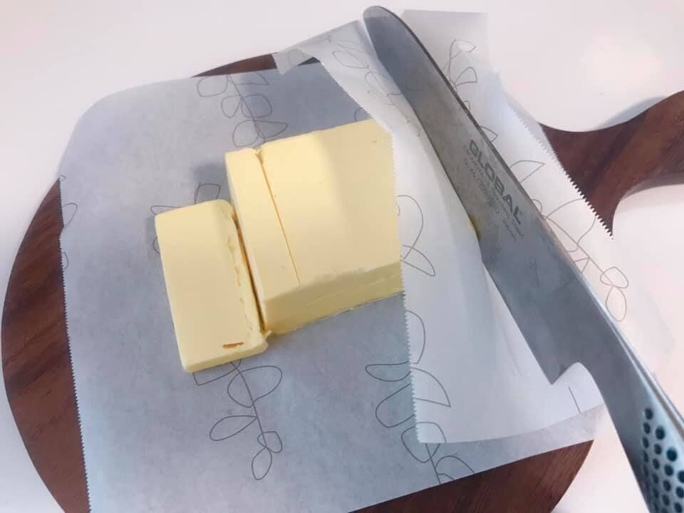 バターをカットするとベタベタとくっついてとても面倒・・・。そんな時はマルチシートの上から包丁でカットすると包丁にくっつくこともなくスパっと切れます。