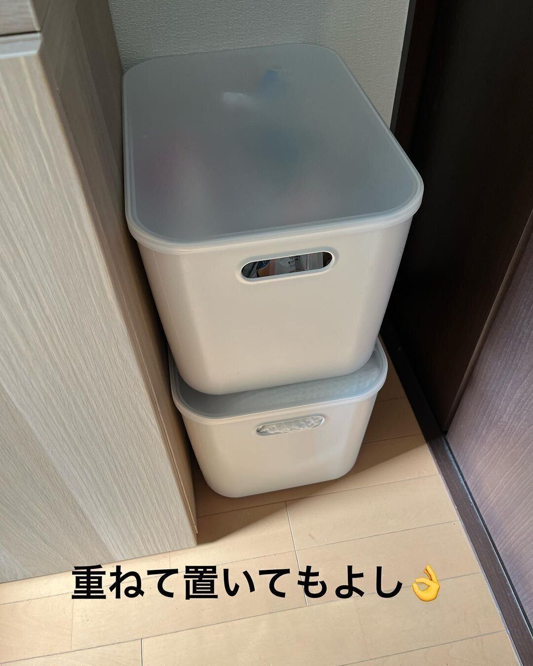 「やわらかポリエチレンケース・ハーフ」は、大・中・小の3サイズ展開。こちらも深さでサイズが異なり、すべて同じふたを使用できます。ルーターを中に入れて、持ち手からコード類を引き出して電源につなぎ、上からふたをかぶせるというアイデアは、床掃除が簡単になるのでぜひ真似したいですね。ハーフのほうは、「大」が590円、「中」が490円、「小」が390円です。