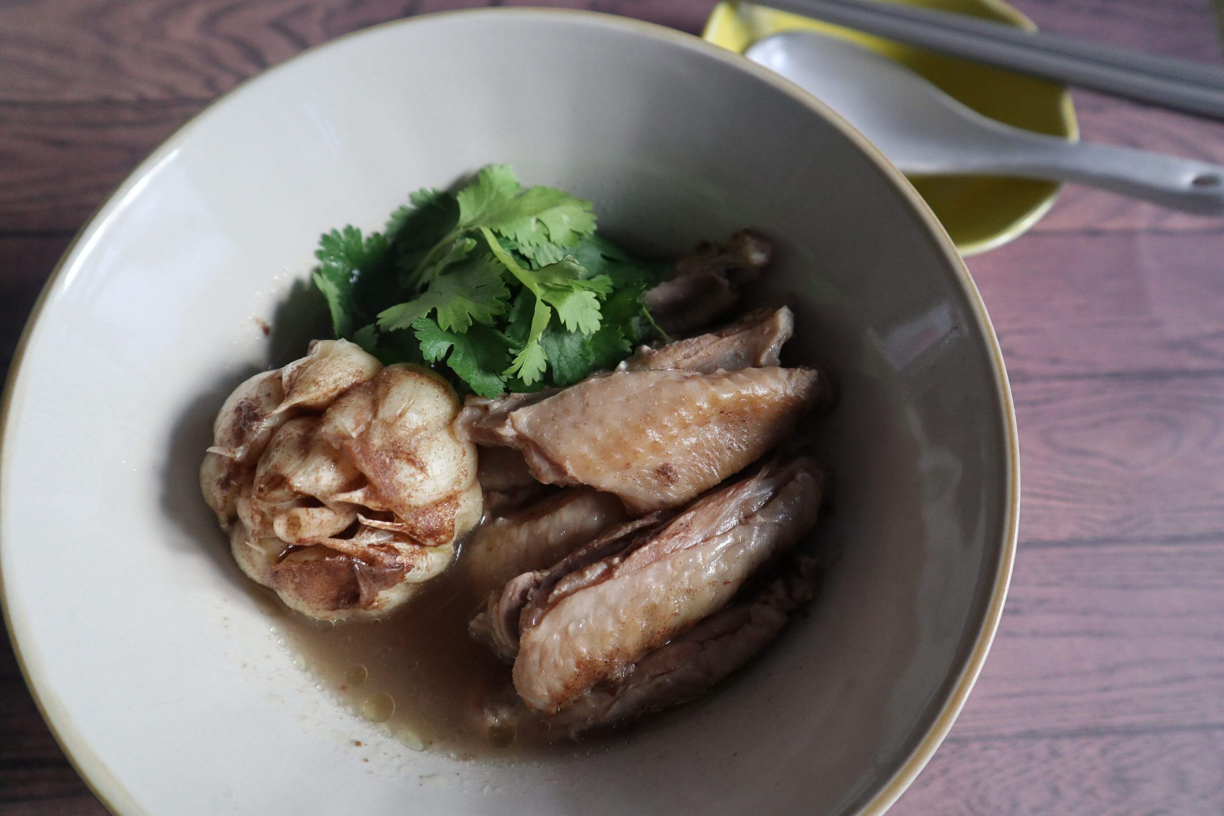 肉骨茶の完成です。見かけによらずスパイシーです。肉の旨みがこれでもかというくらい凝縮しています。じっくりと煮込んだ手羽中もホロホロになっていておいしいです。にんにくも柔らかく煮えていますので、お好みで皮をとりスープに混ぜて食べます。体の中から温まる一品です。