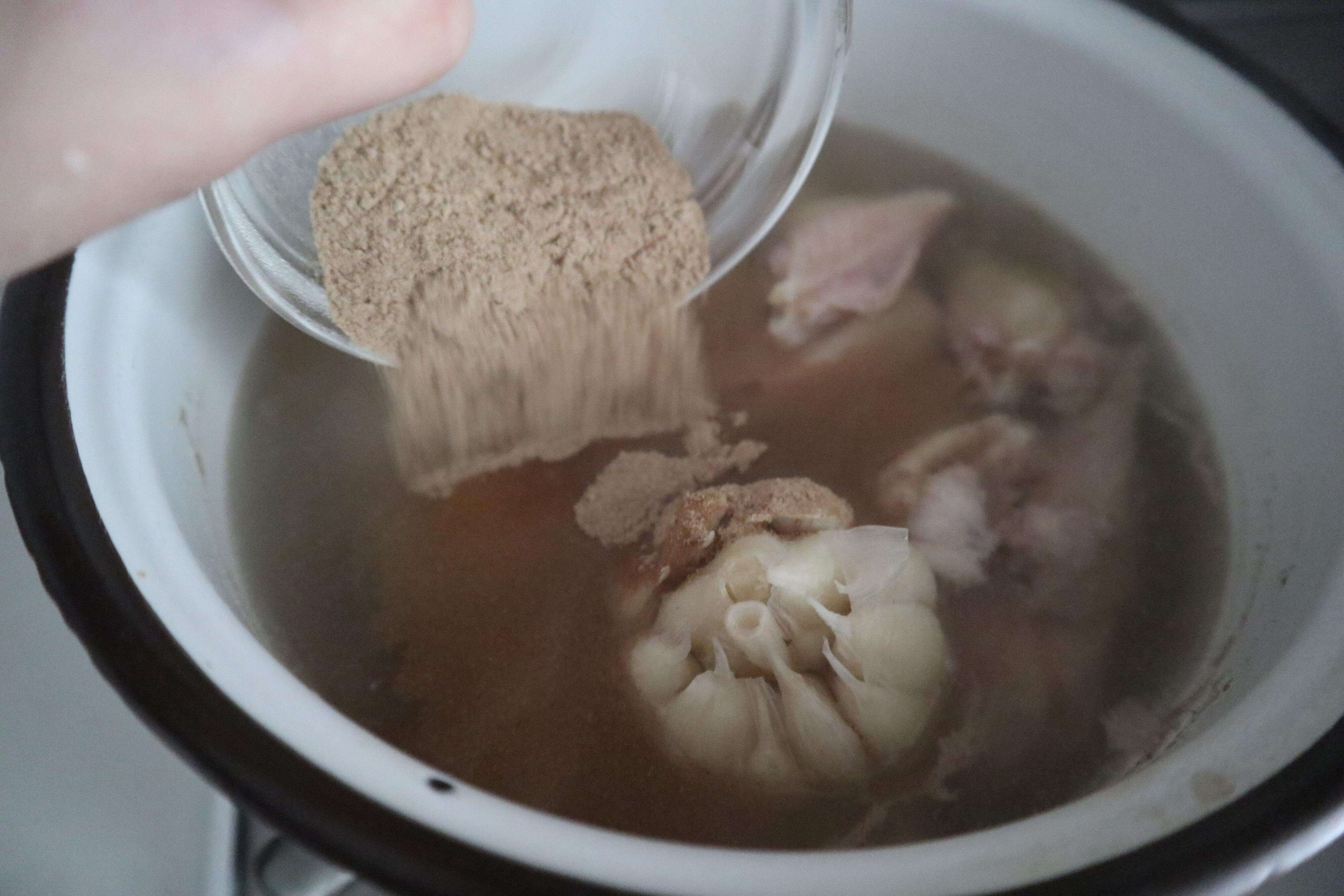 1.水を入れた鍋を火にかけて沸騰させ、手羽中、肉骨花の素、ニンニクを加える。