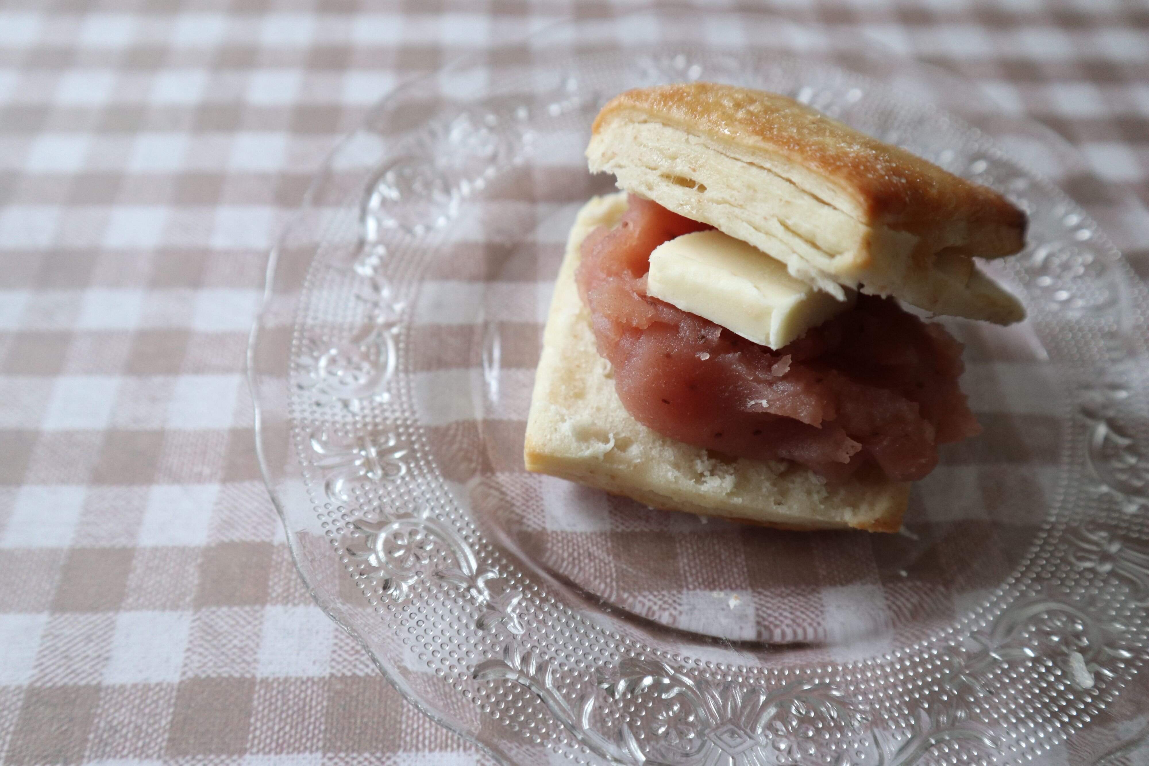 スコーンにいちごあんと有塩バターをはさんで、「いちごあんバターのスコーンサンド」をつくってみました。いちごあんの甘さとバターの塩味が合わさり甘じょっぱさがクセになる1品。ほんのりピンクな見た目もかわいいです。