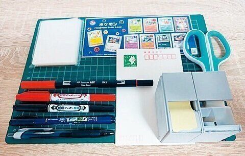 七つ道具あります!私は「(1)黒ペン、(2)セロハンテープ、(3)ハガキ、(4)はさみ、(5)トレーディングカードケース、(6)赤ペン、(7)切手」。取りあえずこれさえまとまっていれば、スムーズに応募ハガキを書く作業に取りかかれますよ。(めぐめぐ。さん)