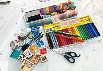 100均の透明の工具入れにマステや文具など懸賞応募セットを収納。(わこさん)