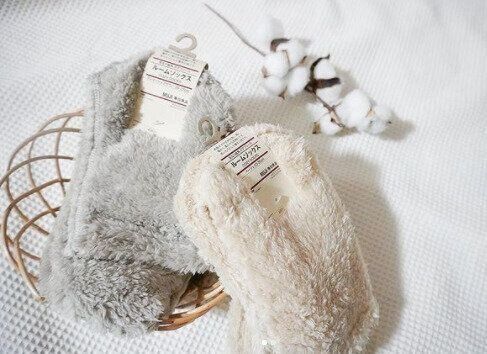 この「足なり直角 ボアフリース ルームソックス」490円は、ふんわりしたボアフリースが足をすっぽり包んでくれます。