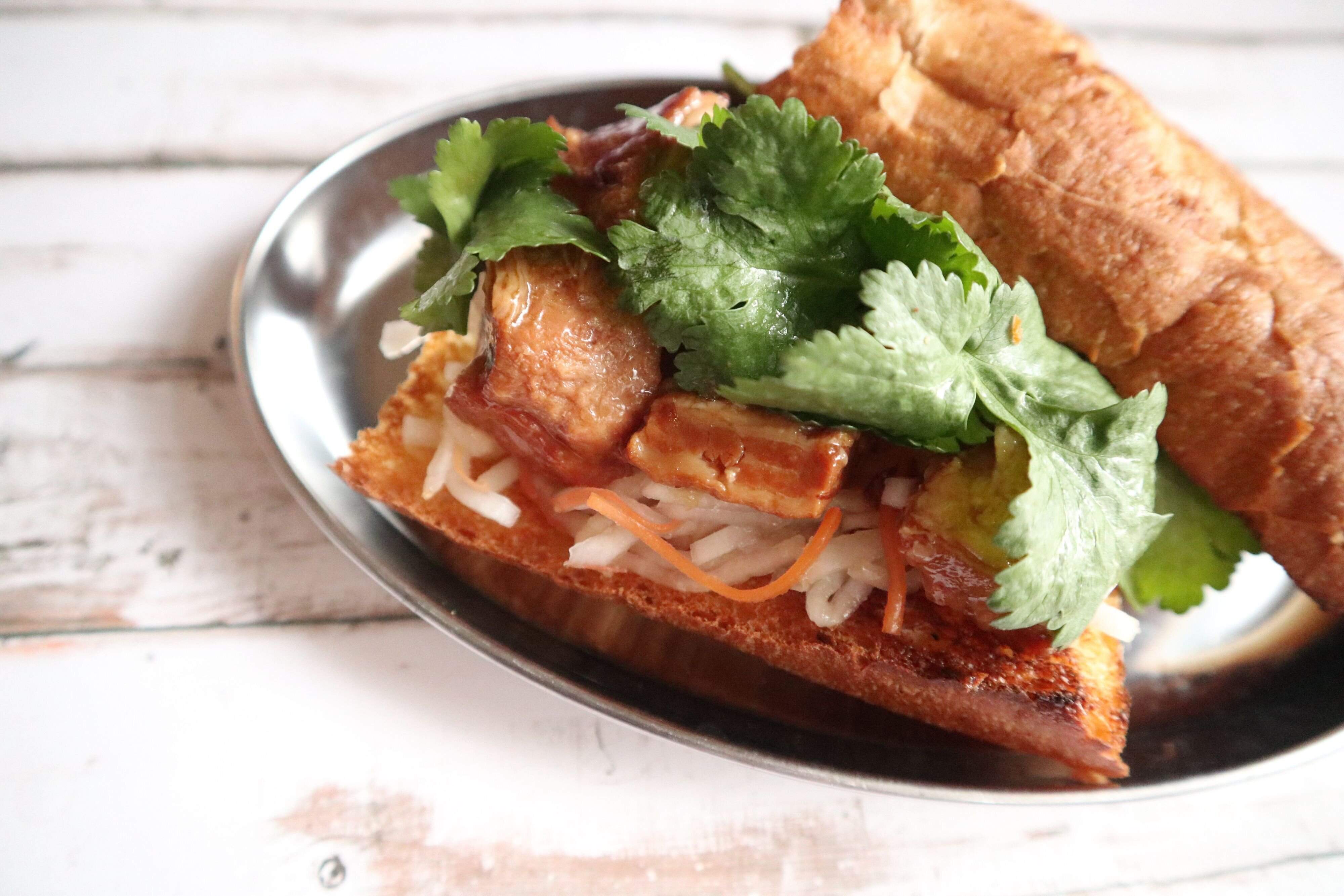 バゲットに金の豚角煮とパクチー、なますをサンドしてバインミー風。