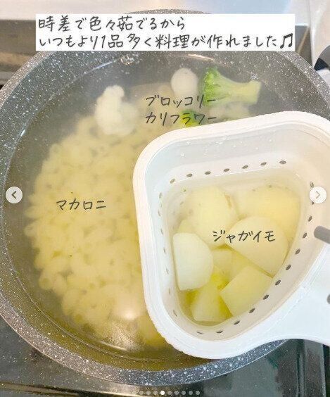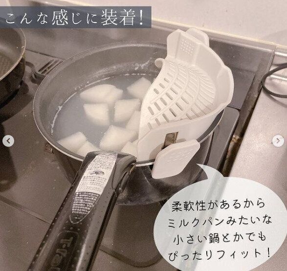 時短が叶う優れものアイテムとしておすすめのものが「クリップ式シリコンザル」(550円)になります。茹でた野菜やパスタなどの湯切りに重宝するこのアイテム。使い方は、ザルについているクリップで鍋にとめるだけ。メリットとしては、大きさがザルの4分の1なので調理台のスペースを取らない、また、茹でた鍋でそのまま湯切りができることなどがあります。さらに、鍋だけでなく、フライパンやボウルなどに取りつけて幅広く使えるところも◎。一度使ってみるとやめられない、技ありアイテムです。