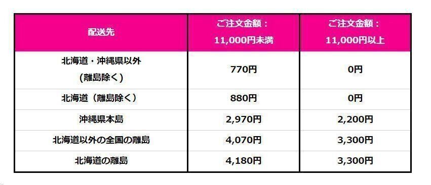送料は770円(税込:北海道は880円)で、総注文金額が11,000円以上になると送料無料です。沖縄県および離島へのお届けはできません。