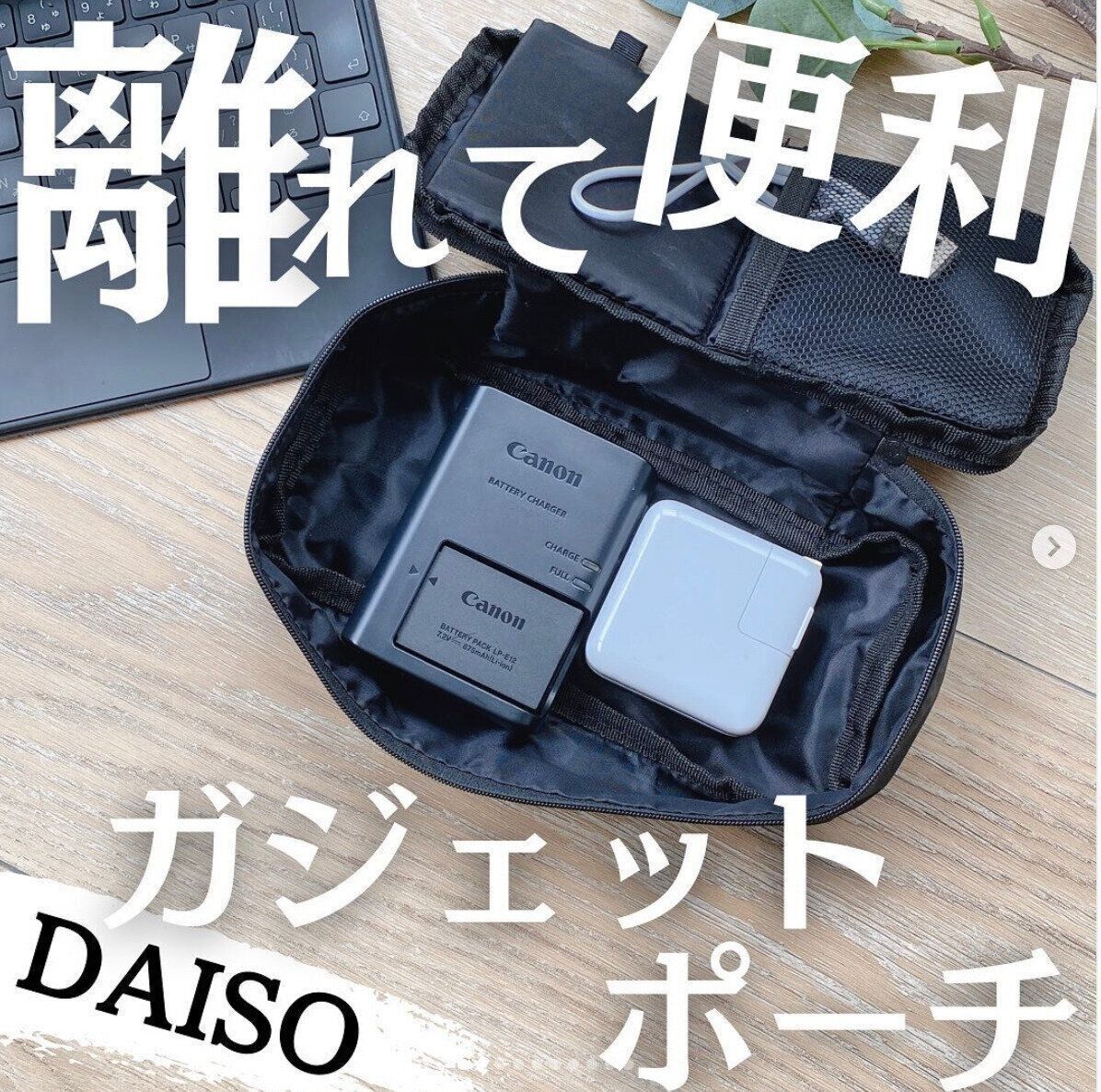 こちらはガジェットポーチとして人気の商品です。中身は化粧品一式や、大きめの充電のアダプタなどが入る大きさ。取り外し可能なポケットは、単体で立てることでペンスタンドになります。バッグにかけて使えるので、コインやペンなど、バッグに入れておくとグチャグチャになりやすいものを収納するのにぴったりです。たったの220円で販売中です。