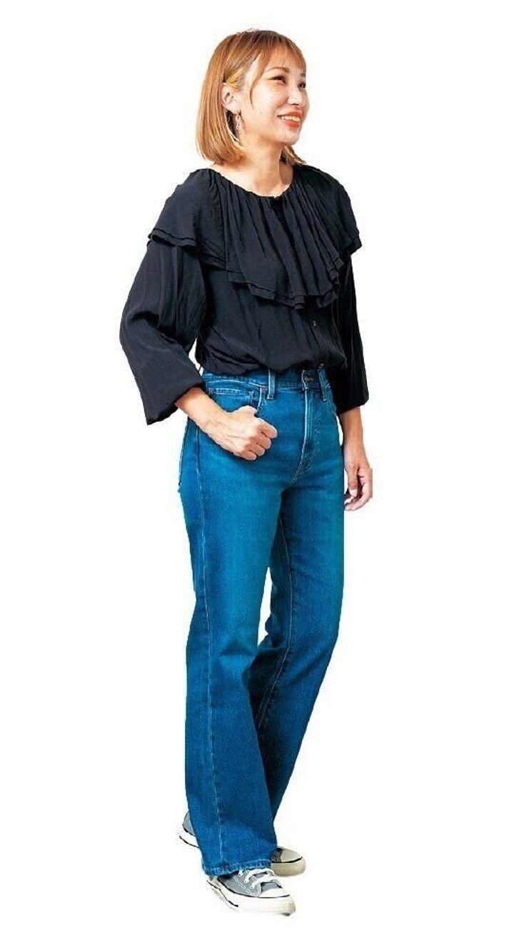 今年らしい形で、脚長効果も高い。「フレアハイライズジーンズ」¥3,990 /ユニクロ ※一部店舗のみで販売。
