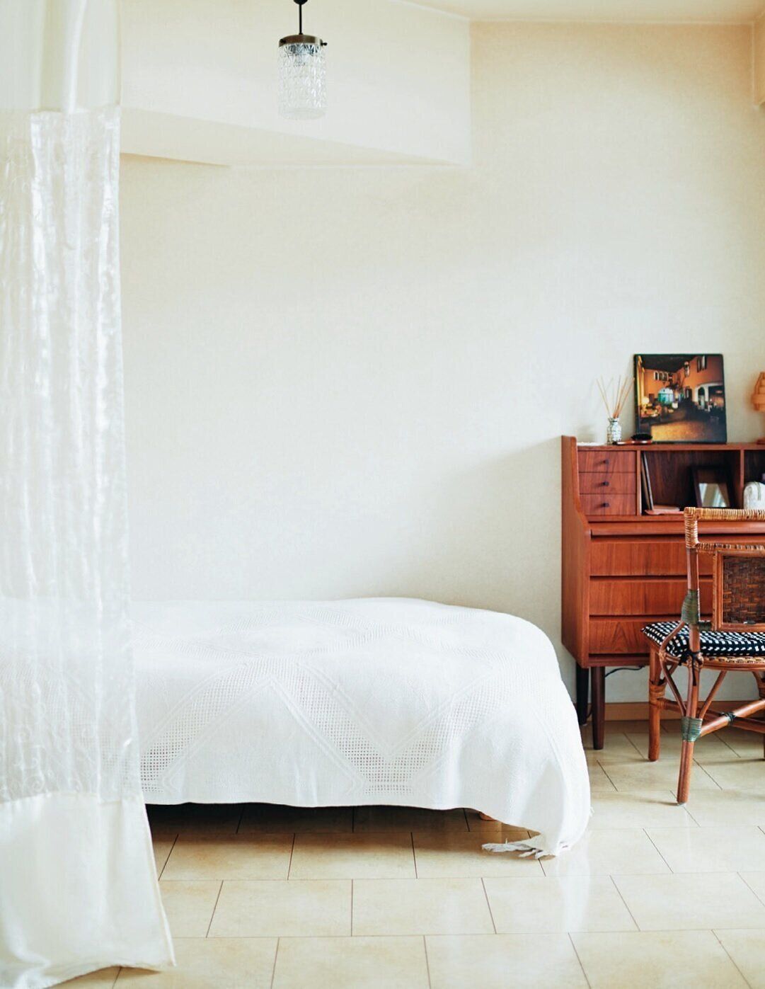 部屋を仕切っていた折り戸を外し、ワンルーム風に。フレームレスのベッド、チェストと机を兼ねたライティングビューローに替えたら、部屋が広々し、移動がしやすくなりました。