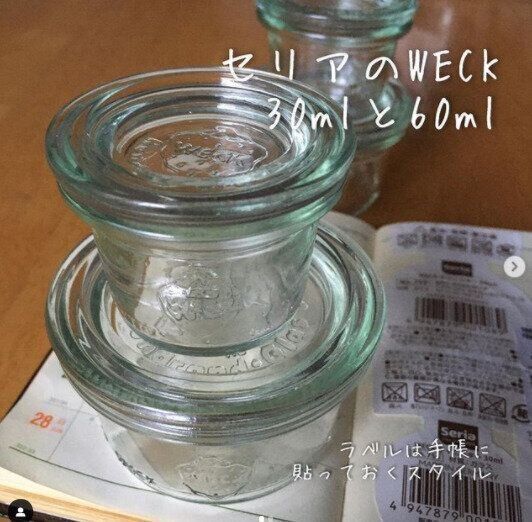 セリアにあるWECKの容器。30mLとすこし大きめの60mLの2種類があります。卵黄の醤油漬けをつくるのにもぴったりの大きさ。いろいろ活用できそうですね。