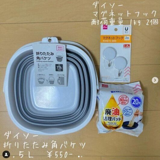 折りたたむことができるダイソーの角バケツ。容量は7.5L、価格は550円です。バケツは収納に場所を取ってしまいますが、折りたたむことができれば、狭いスペースでも効率よく収納することができそうですね。