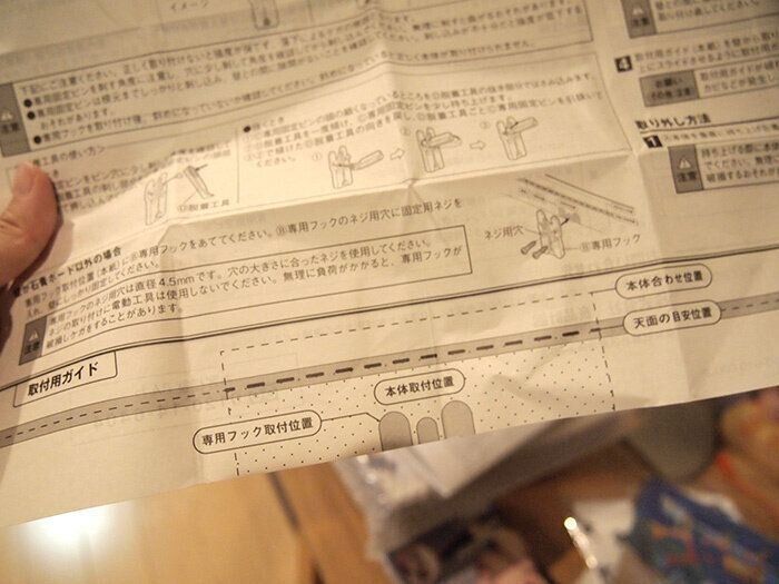 無印良品の壁につけられる家具は、賃貸住宅とか、木の柱の入ってない壁にもつけられるというところがすごいんです。使いやすいんです!大概、どんなところにもつけられます。説明書のようなものが入っているのですが、これをガイドにして狙った位置に簡単に設置することができます。