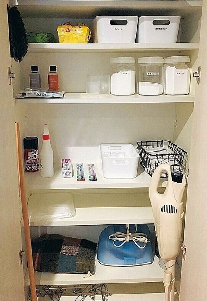 収納スペースがあるほど、つい安心して物を増やすことに。「棚の中の収納BOXも必要最小限に。どこに何があるかわかりやすいから、夫も出し入れしやすい!」。