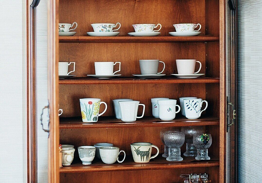 「昔は来客も多く、かなりの数の食器がありましたが、一人暮らしになってからは最小限に。かつて使っていた食器の一部は息子夫婦に譲りました」。自分好みのカップ類は棚に入る分だけ残し、ながめて楽しんでいます。