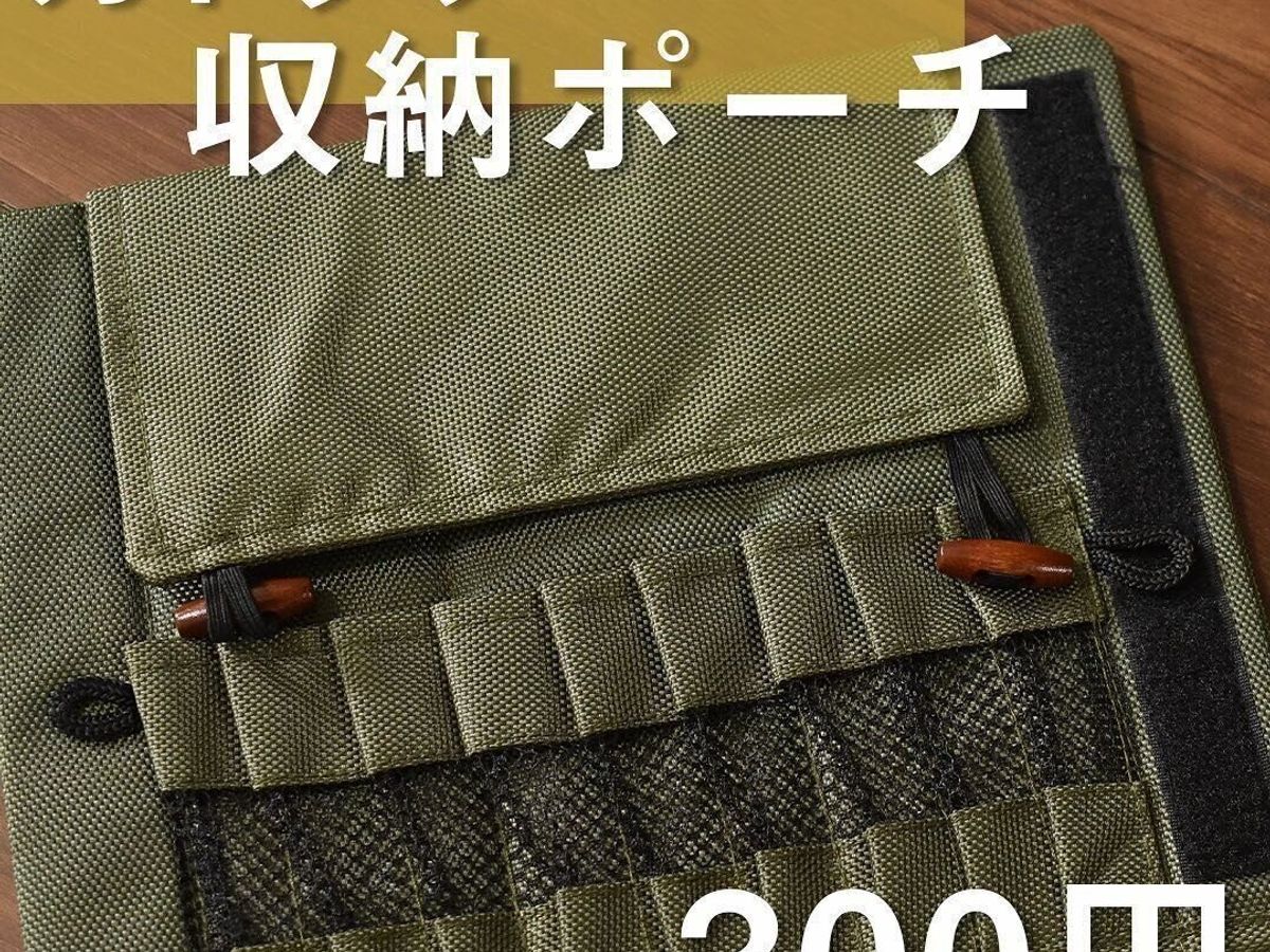 キャンプのときに活躍する仕分けポケットが9つもついているカトラリー収納ポーチが、ダイソーなら330円とお手頃価格で購入できます。飛び出し防止で先端をガードするカバーがあり、たたんでマジックテープで留めると自立させることもできます。持ち手がついているのでフックなどに吊り下げることもできるすぐれものです。