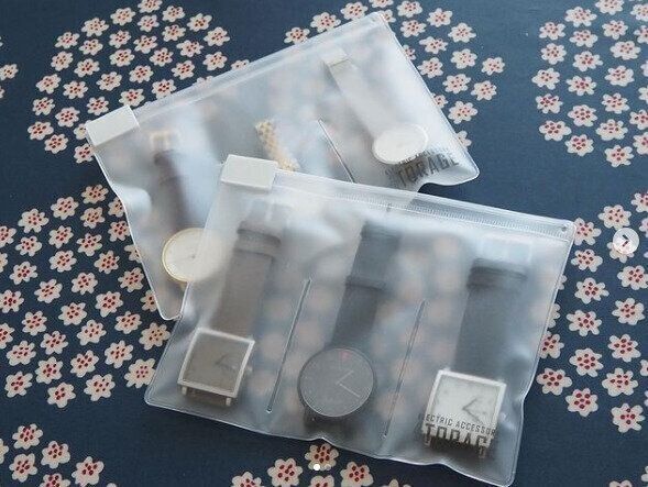 「さすがセリア!」と言いたくなるアイテムが、こちらの「しわけられる!EVAスライダーポーチ」です。一見ふつうのスライダーポーチにしか見えませんが、中に仕切りがついているのが注目ポイント。これのお陰で、こまごましたものが別々に収納できるからとても便利です。スマホのケーブルや充電器などはもちろん、腕時計などの収納にもおすすめ。傷つきやすい時計もEVAポーチなら安心ですね。アイデア次第で、いろいろなものの収納に使えるポーチだと言えるでしょう。