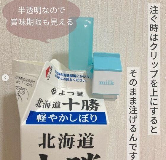 「買ってきた牛乳が最後までおいしく飲める」と評判なのが、この「牛乳パッククリップ」です。開封した牛乳パックに取りつければ、しっかり密閉して、冷蔵庫のにおいから守ってくれるため、最後までおいしい牛乳を飲めるでしょう。しかも、注ぐときはクリップを上にあげるだけでOK。クリップをそのつど取り外しする必要がなく、手間が省けますね。半透明で消費期限もきちんと見えるところも、よく工夫されている点となります。これぞまさに技ありアイテムと言える商品です。