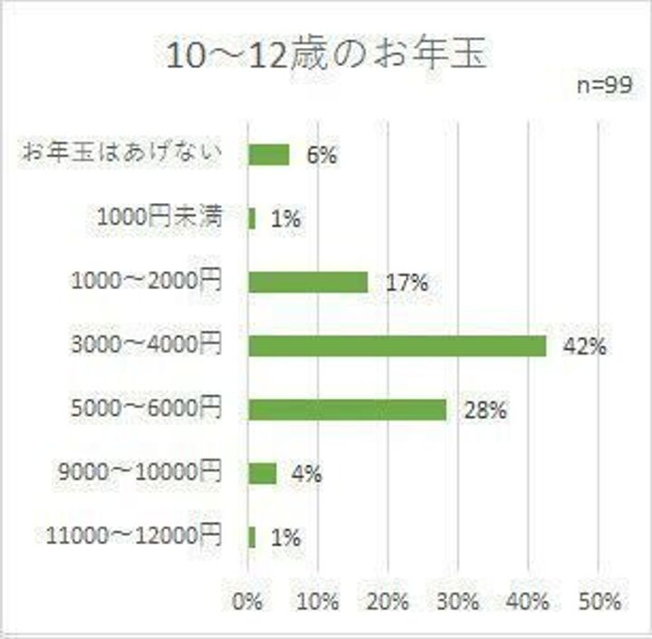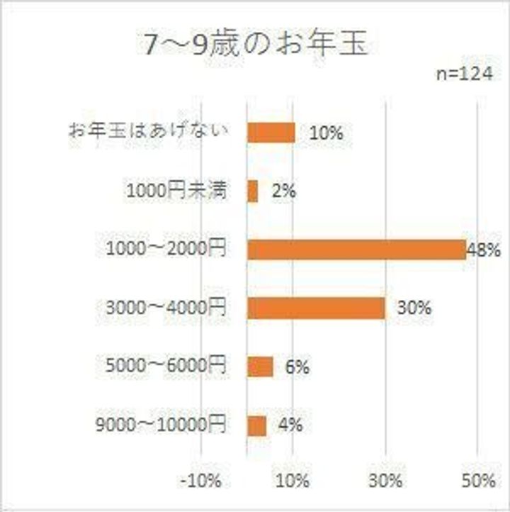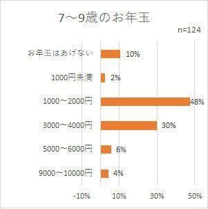 小学生になると、7~9歳は1000~2000円までが48%、10~12歳は3000~4000円が42%ともっとも多くなっています。おそらく学年×1000円くらいの金額で考えている人が多いようです。