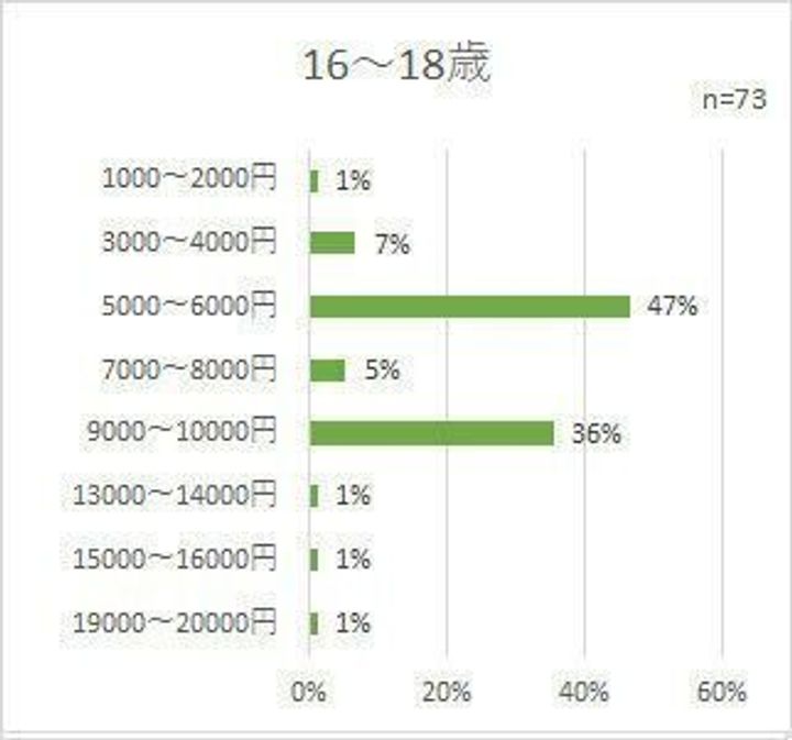 中学生では2番目に3000~4000円、9000~10000円が15%ずつと、金額に大きく開きがでています。高校生では2番目に9000~10000円が36%となり、金額が中学生の頃よりステップアップしている場合も少なくないようです。