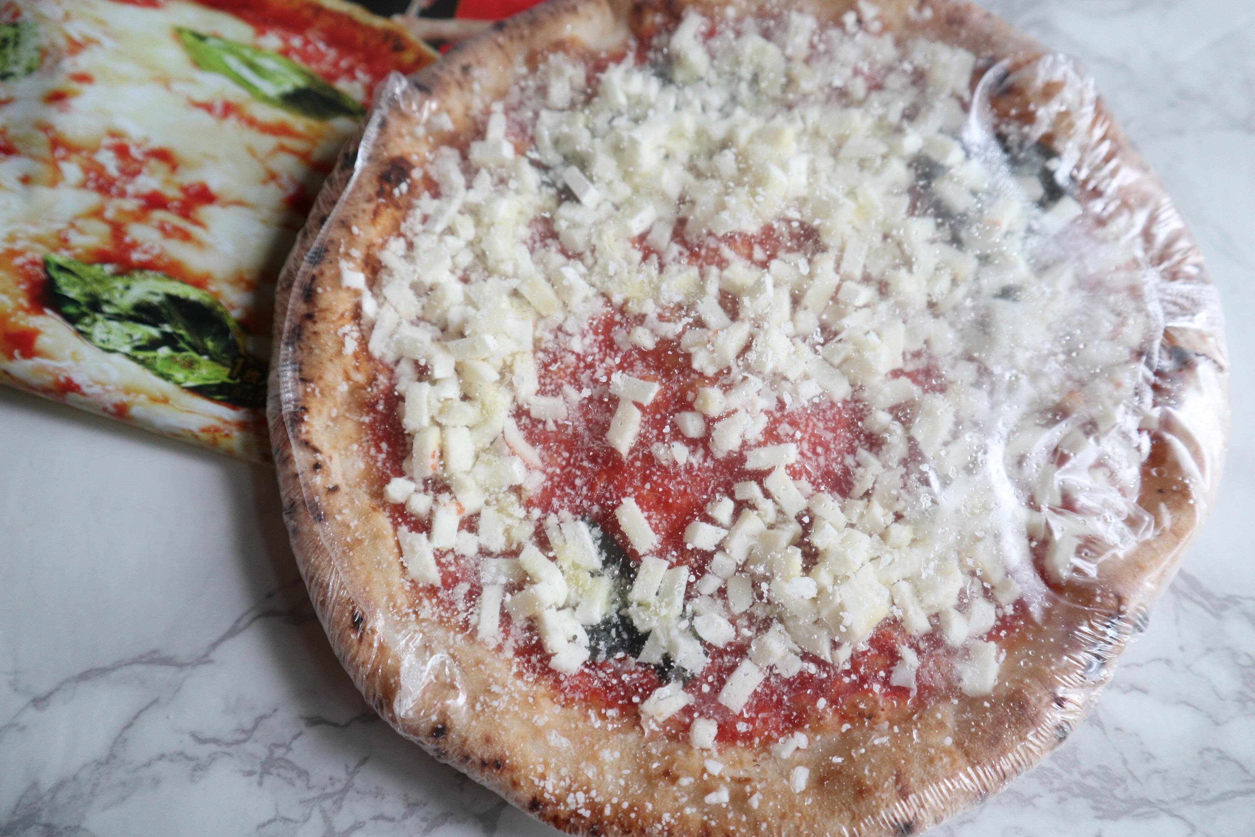 私は、冷蔵庫で7時間自然解凍して、250度のオーブンで3分半焼きました。焼く前にピザの縁に水を霧吹きでかけるとさらにもちもちに焼きあがります。