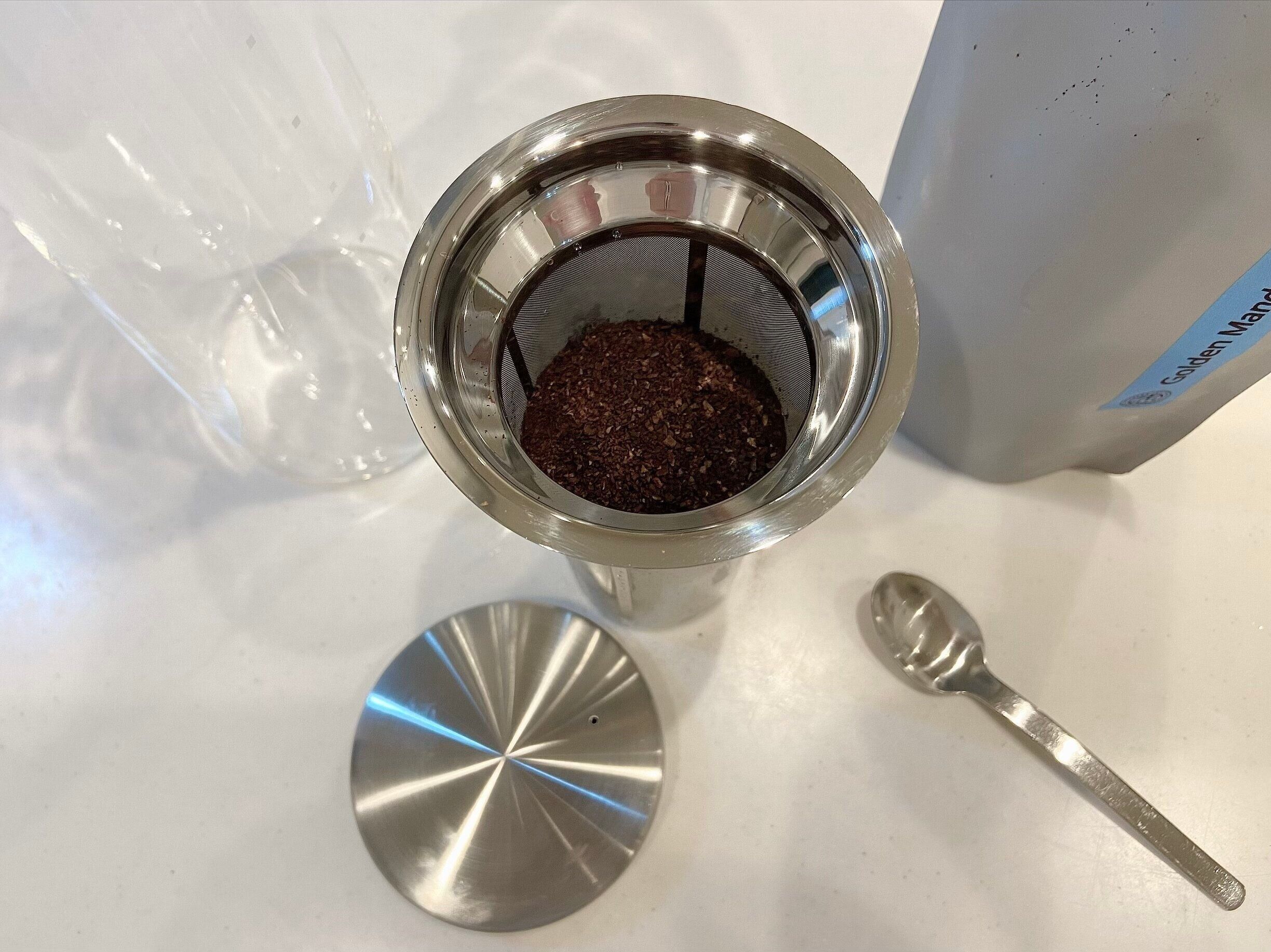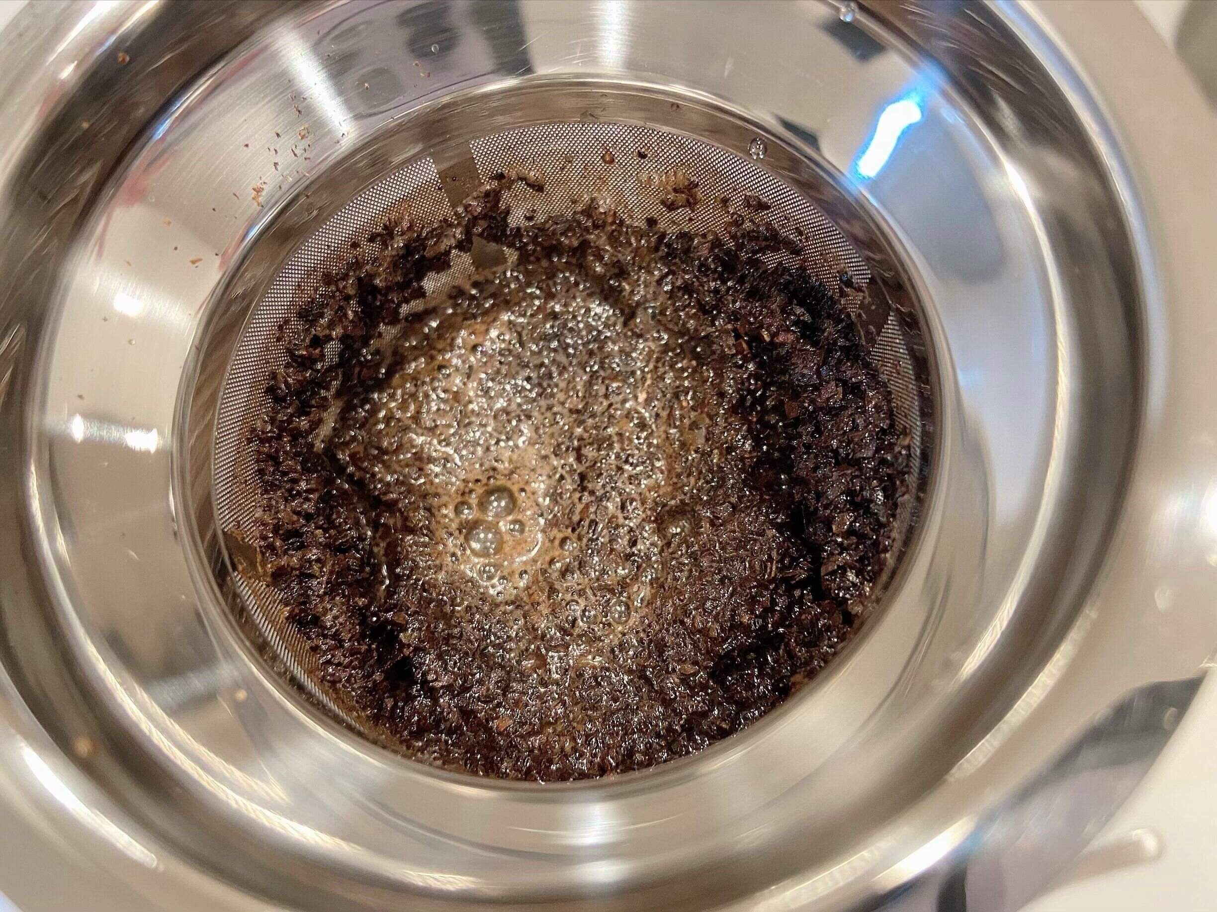 最後に少しだけガラスポットの底に微粉が残るので、最後まで注ぎきらないようにするのがおすすめ。また、ストレーナーにガラスポットとひっかかりができるようにバネのようになっているのですが、注ぐときは手で押さえる必要があります。