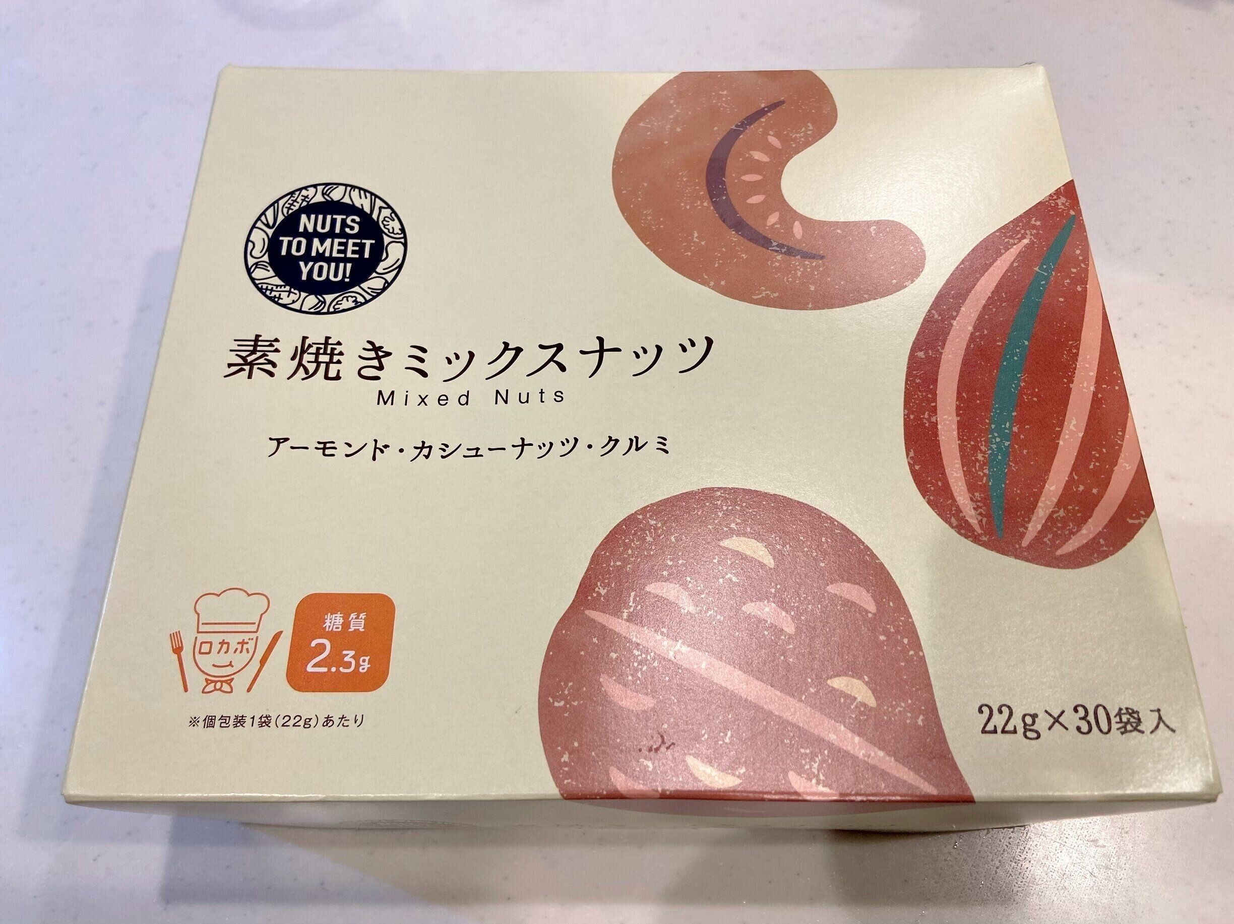 中身はアーモンド、カシューナッツ、くるみの3種類。1袋に入っている量は22gです。