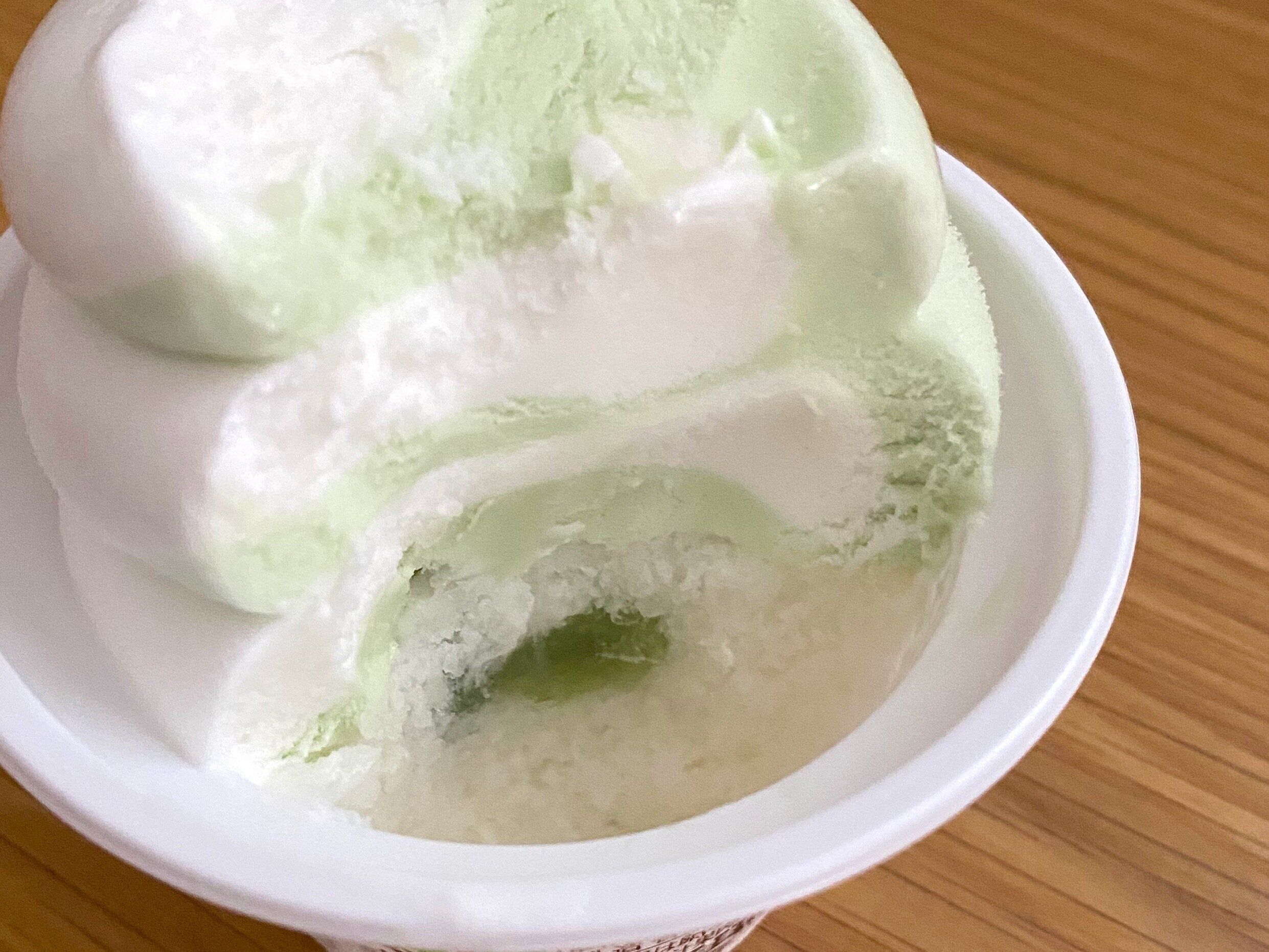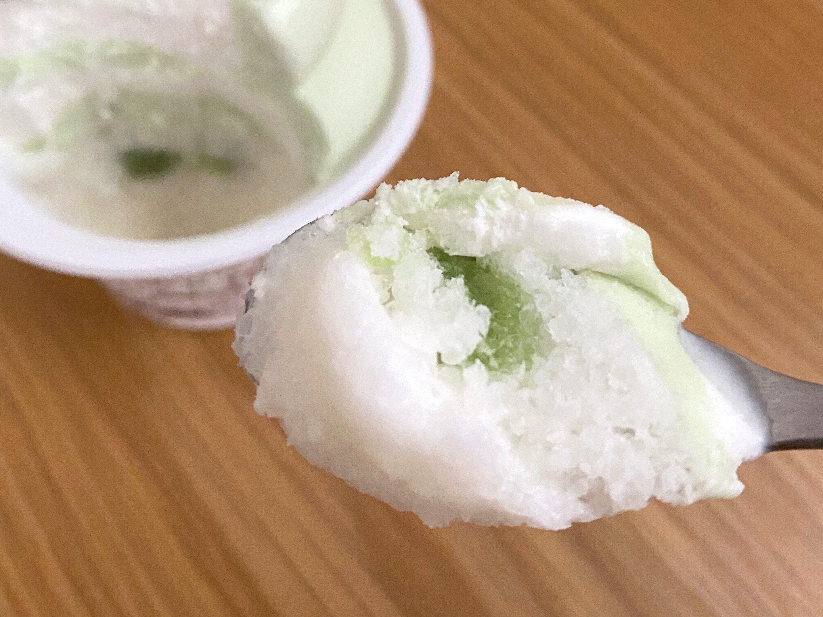 下層はメロンソース入りのカキ氷、上層は練乳とメロンの2種の味が楽しめるうずまきソフトという構成になっています。