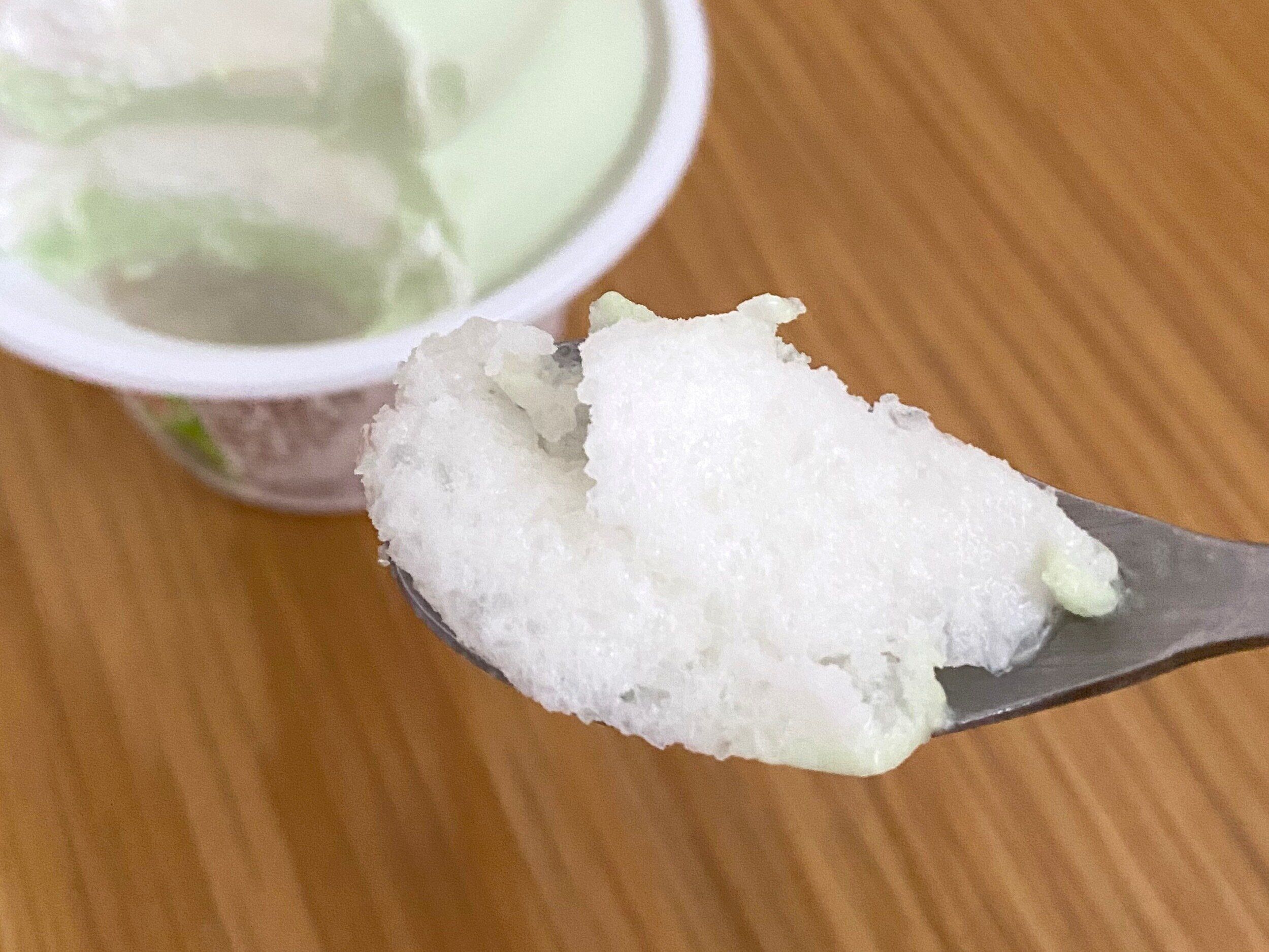 下層の練乳カキ氷はシャリシャリ食感でさっぱりとした味わいです。練乳とカキ氷は間違いない組み合わせですね。
