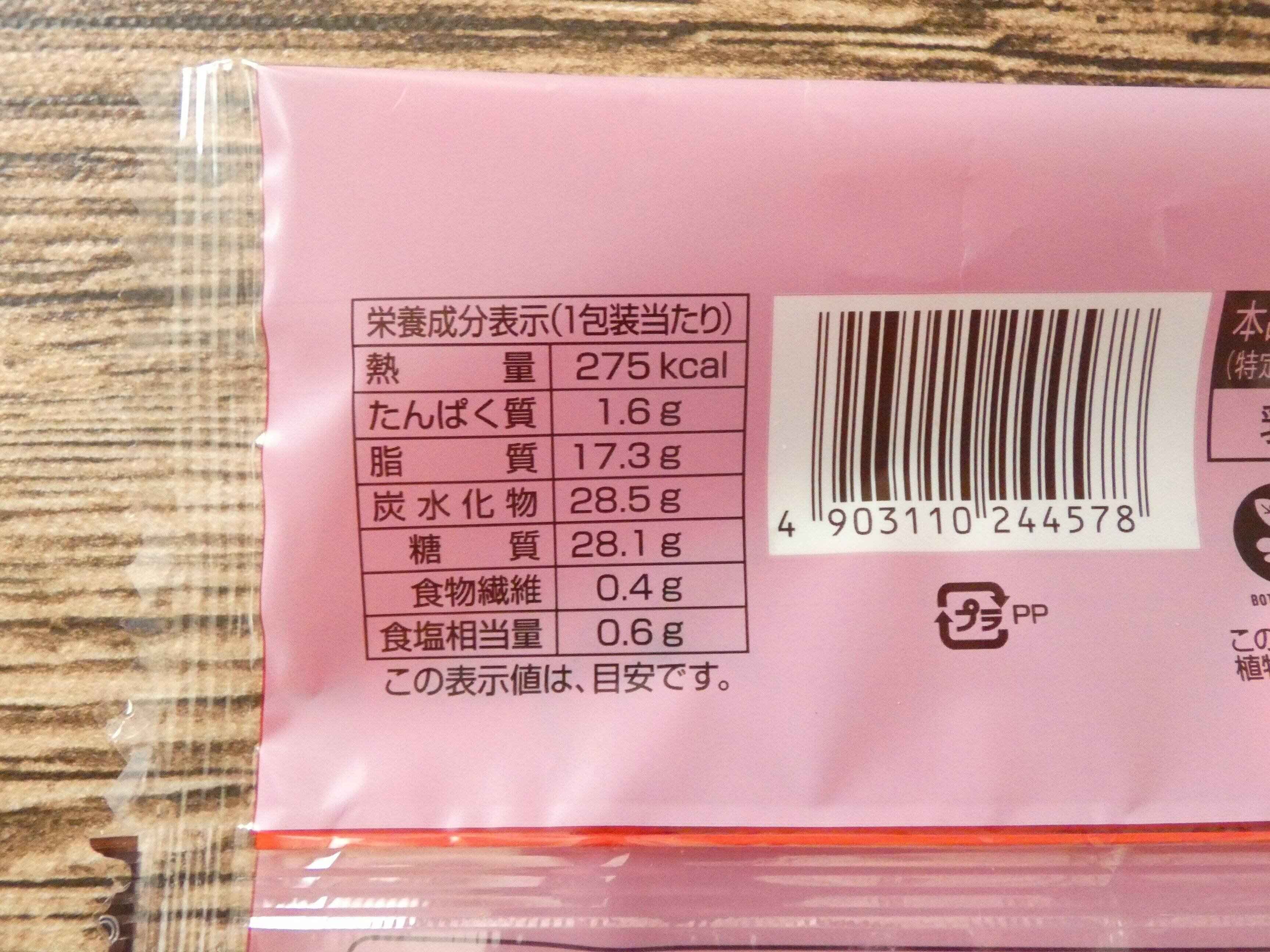 栄養成分表示を見ると、1個のエネルギーは275kcalです。