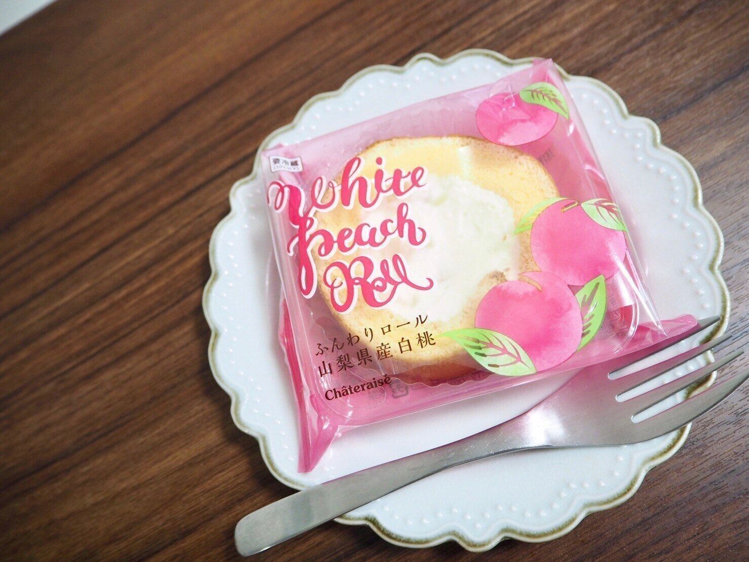 シャトレーゼで大人気、ロールケーキの白桃バージョンだなんて買わずにはいられませんでした。パッケージの水彩イラストが可愛い。