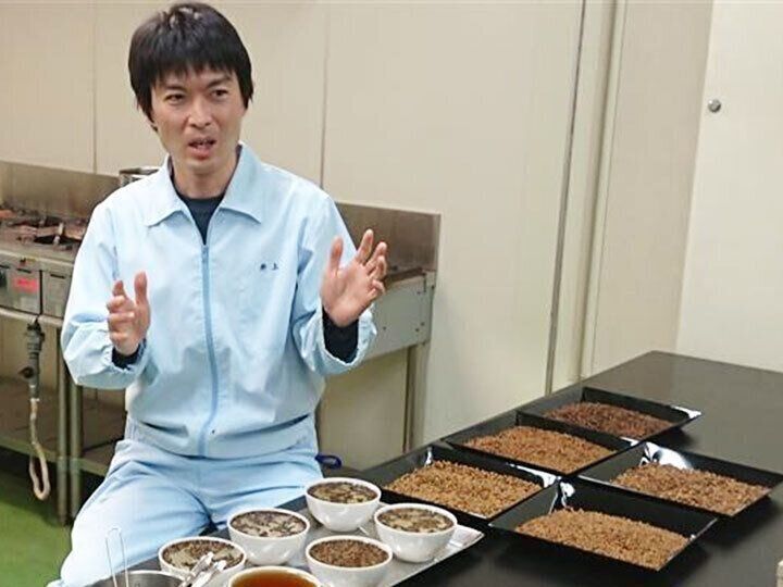 「六条大麦を媒体焙煎すると麦粒の中がスポンジ状になります。そこにお湯が入るので、しっかりと抽出され、濃度感のある味わいを引き出すことができるのです。検茶は開発の第一歩で、私たちは常に、最適なバランスを探しているんですよ」