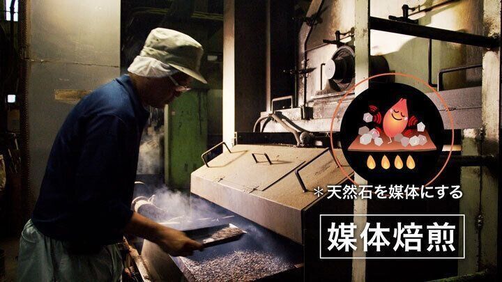 「一般的な麦茶では、熱風焙煎のみを採用していますが、健康ミネラルむぎ茶では香ばしい香りと、甘いコクを引き出すために、熱風焙煎に加えて、媒体焙煎も採用しています。熱風焙煎は、時間をかけて熱風を当てることでやさしい甘さを引き出します。