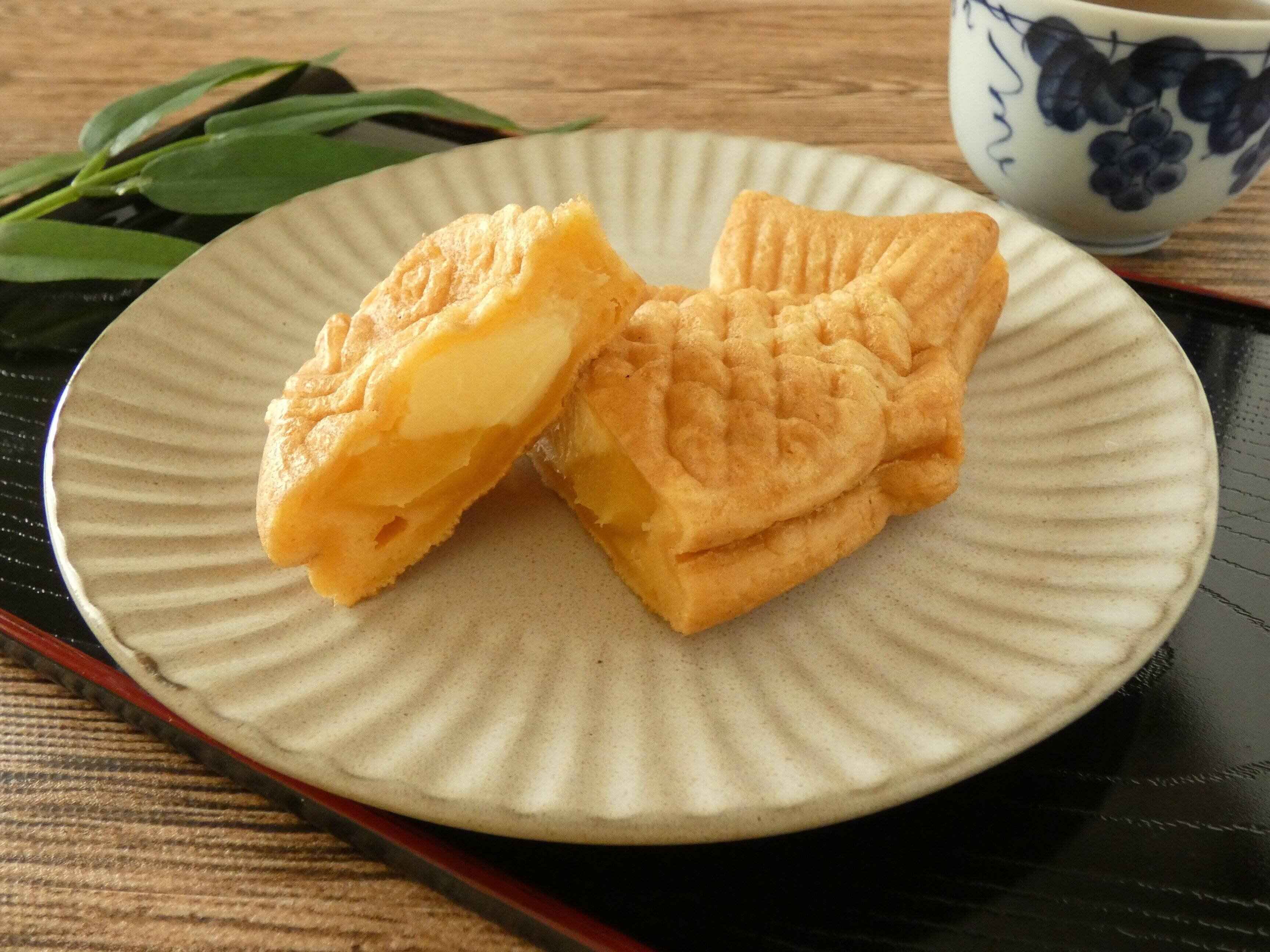 手のひらサイズで、南九州産(鹿児島県・宮崎県)のさつまいものペーストを使ったスイートポテトクリームと、ミルク風味のカスタードクリームを中に詰めたたい焼きです。