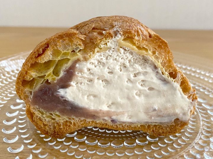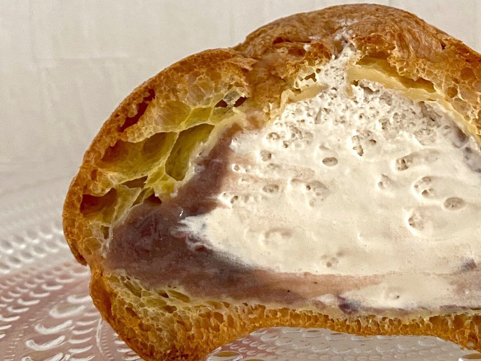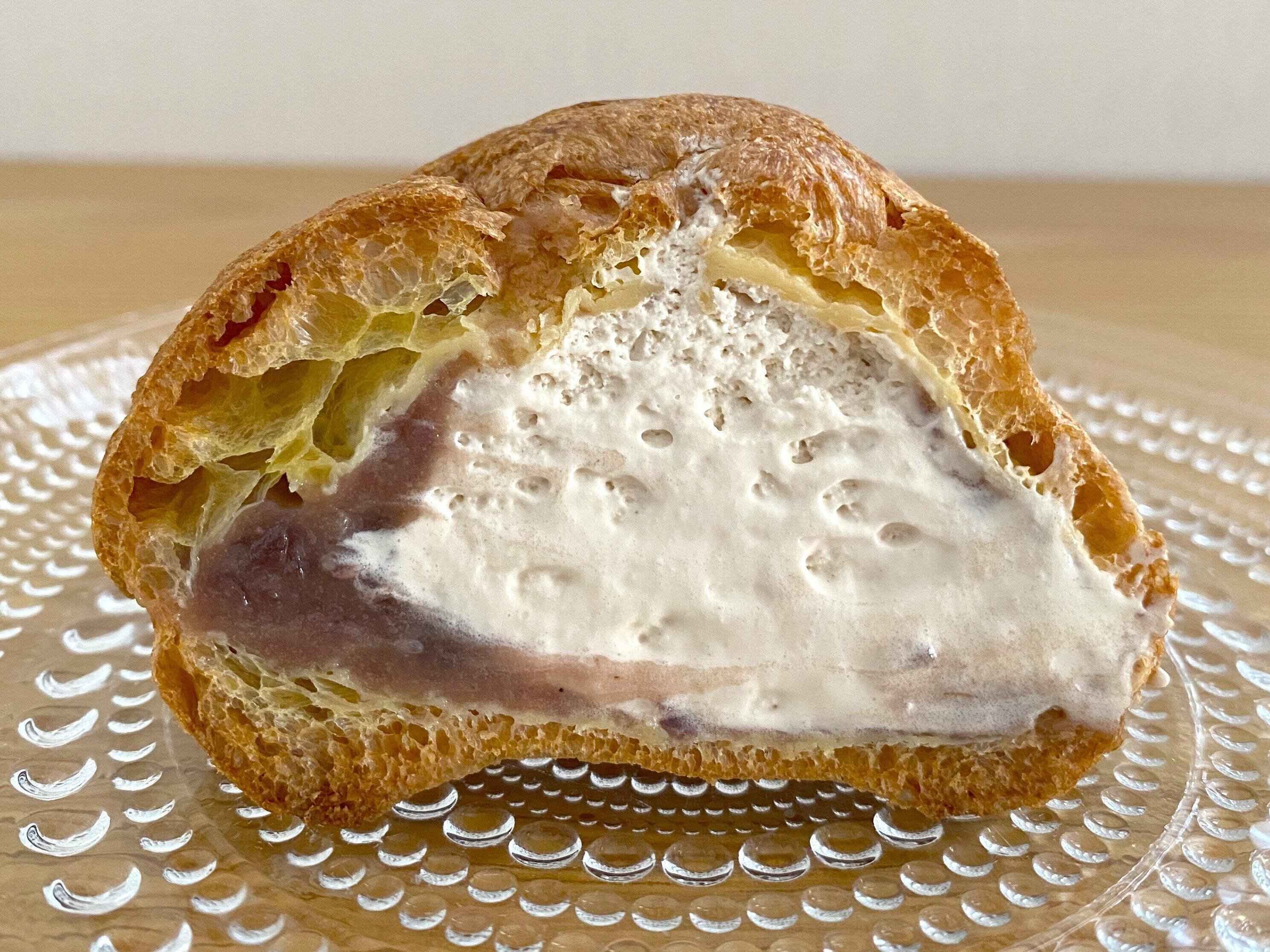 カットしてみると、シュー生地がやや分厚めになっていて、黒みつクリームとつぶあんカスタードの2層になっていることがわかります。