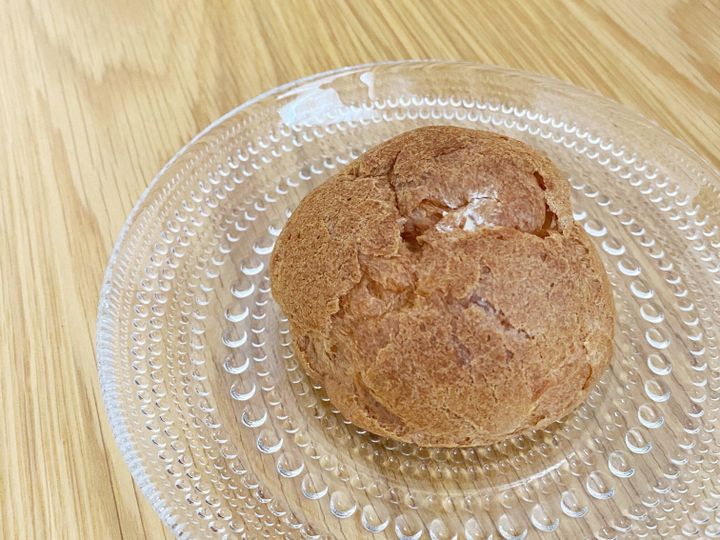 手のひらにちょこんと乗るやや小ぶりサイズのシュークリームです。こんがりとしっかり目に焼かれたシュー生地からはほんのり香ばしい香りがします。
