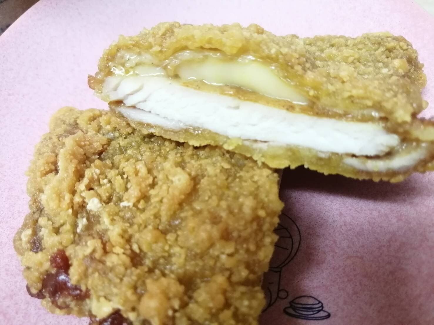 カロリーは298.2キロカロリーと高めなのですが、「ファミマ夏のカレー祭り」が期間限定なので「チーズインカレーファミチキ」と二度と出会えないのかも!?となると、つい注文してしまいます。見た目は普通のファミチキです。次は気になるチーズの様子がわかるように半分に切ってみました。