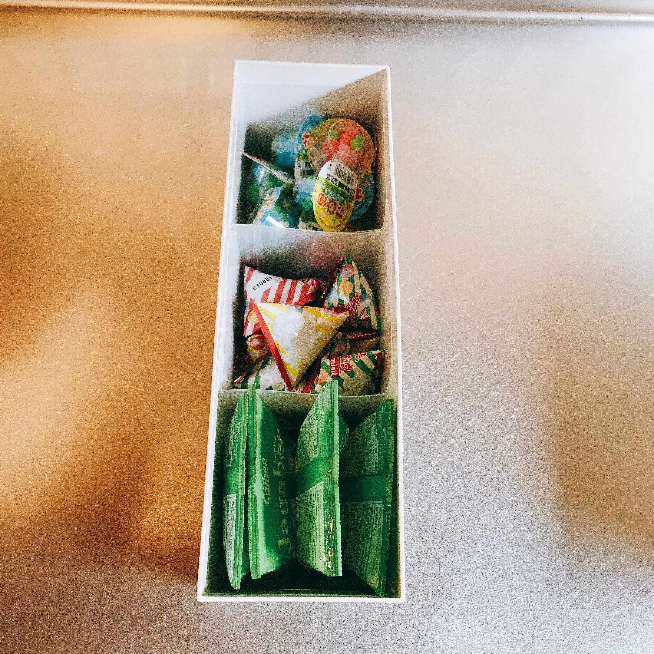 個包装のお菓子を、仕切りごとに入れれば、散らばることなくスッキリ!キッチンやリビングに、そのまま持ち運ぶことも可能です。