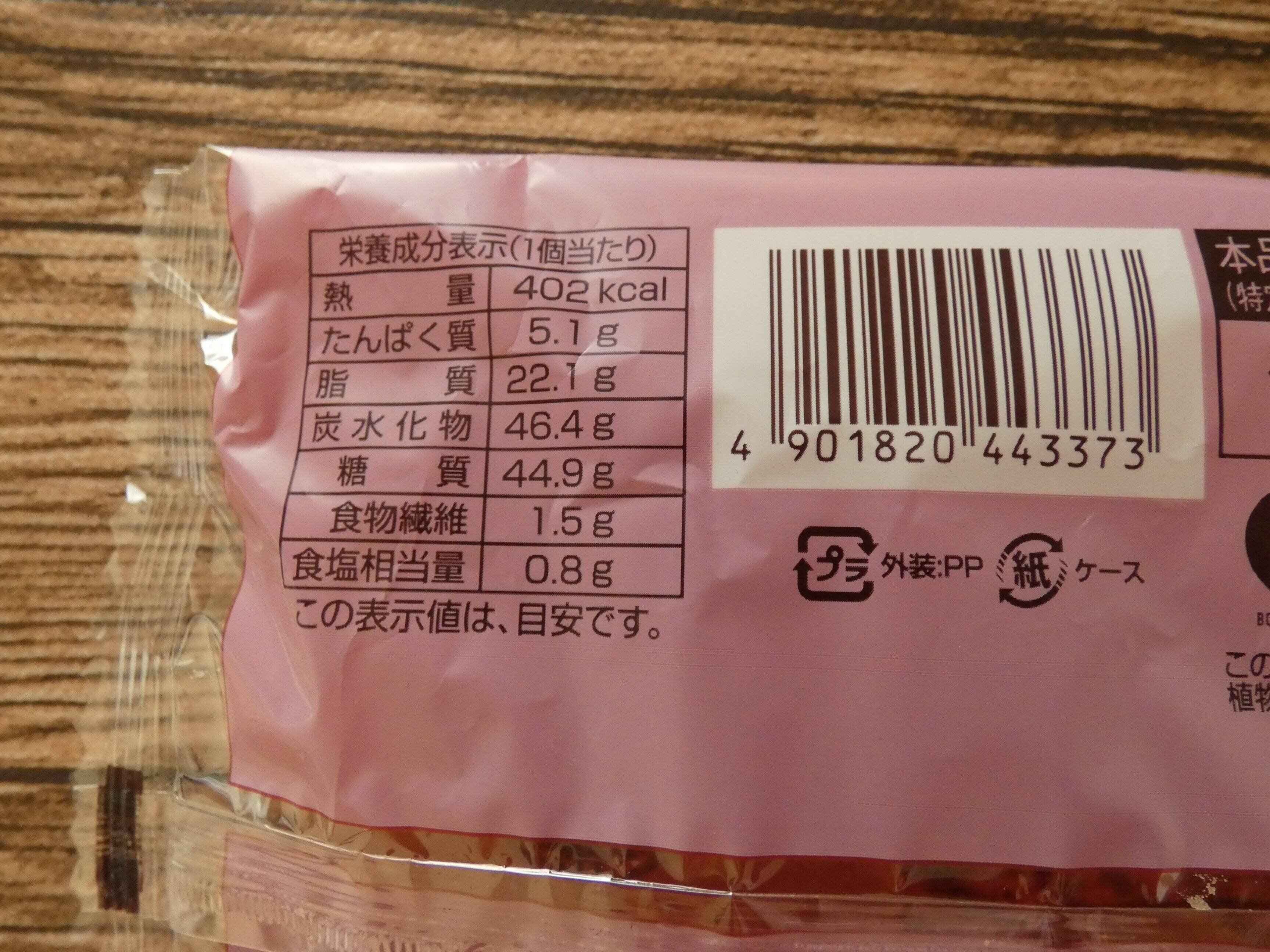 栄養成分表示を見ると、1個のエネルギーは402kcal。カロリー高めのスイーツパンです。