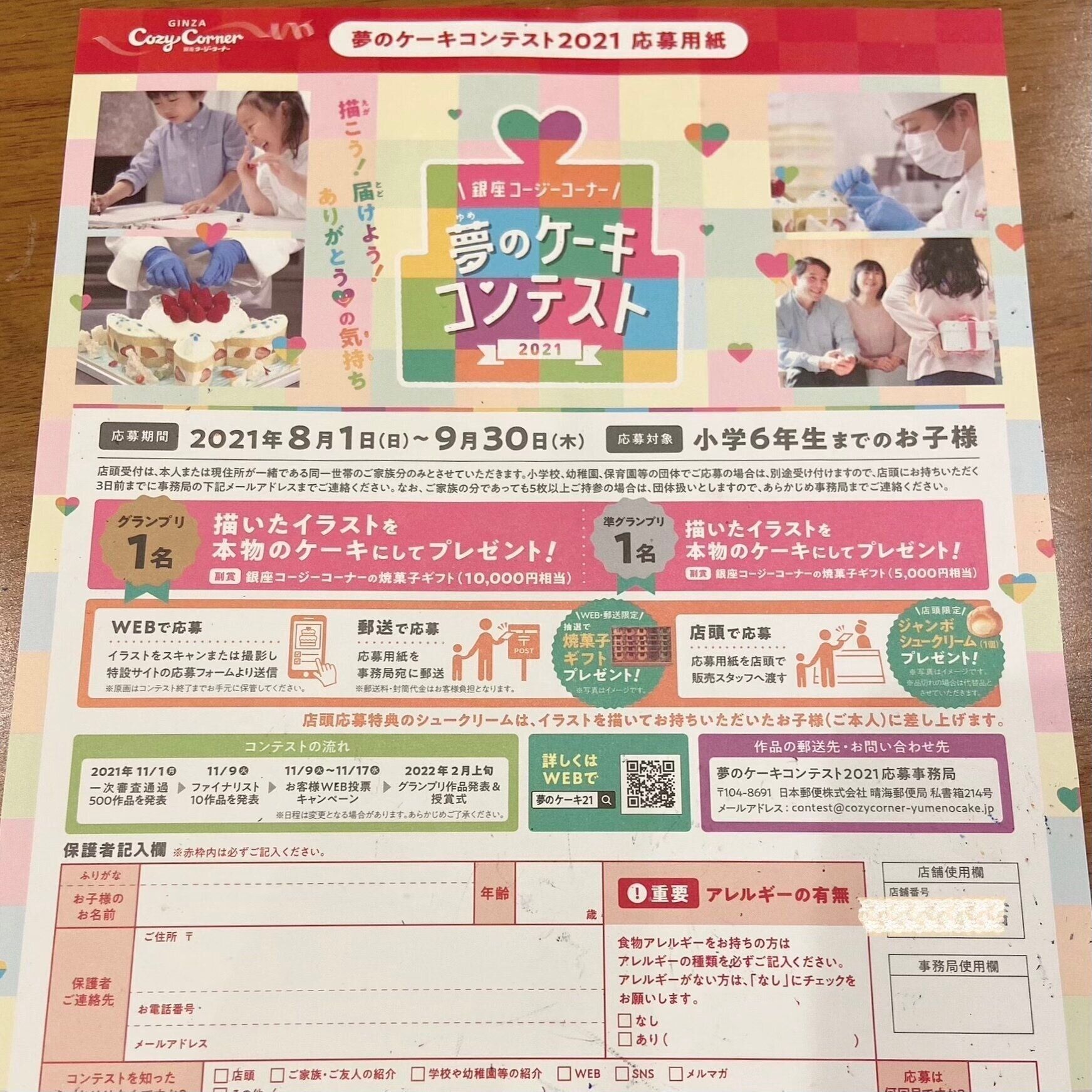 今年も銀座コージーコーナーで「夢のケーキコンテスト」が始まりました!先日ケーキを買いに行った際に、優しい店員さんが「どうぞご参加ください」と笑顔で子どもたちに応募用紙を渡してくれました。