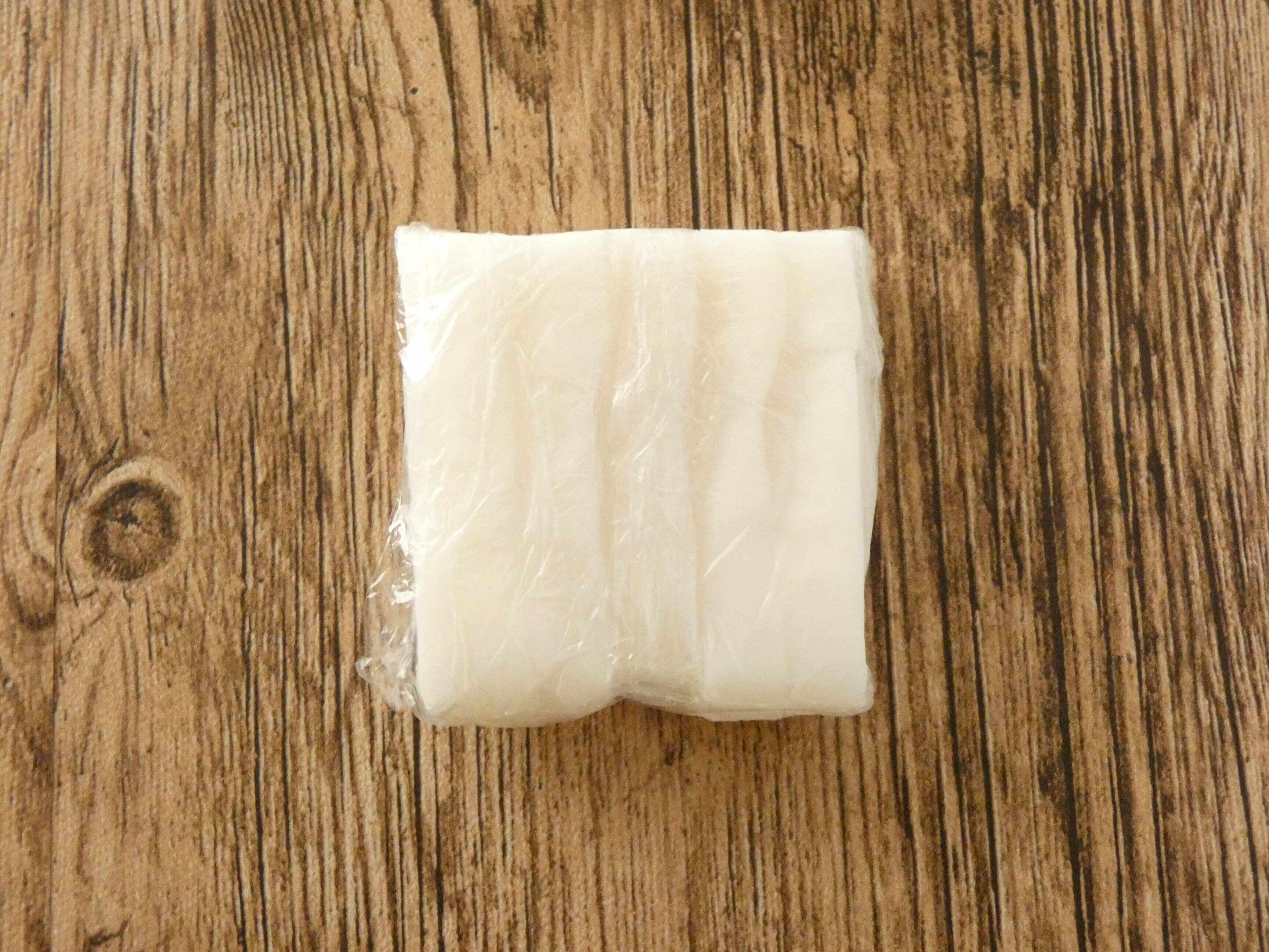 開けてみるとわらび餅が板状になっています。食べるときは小さくカットしますが、切るのが大変なくらいもっちりとしています。