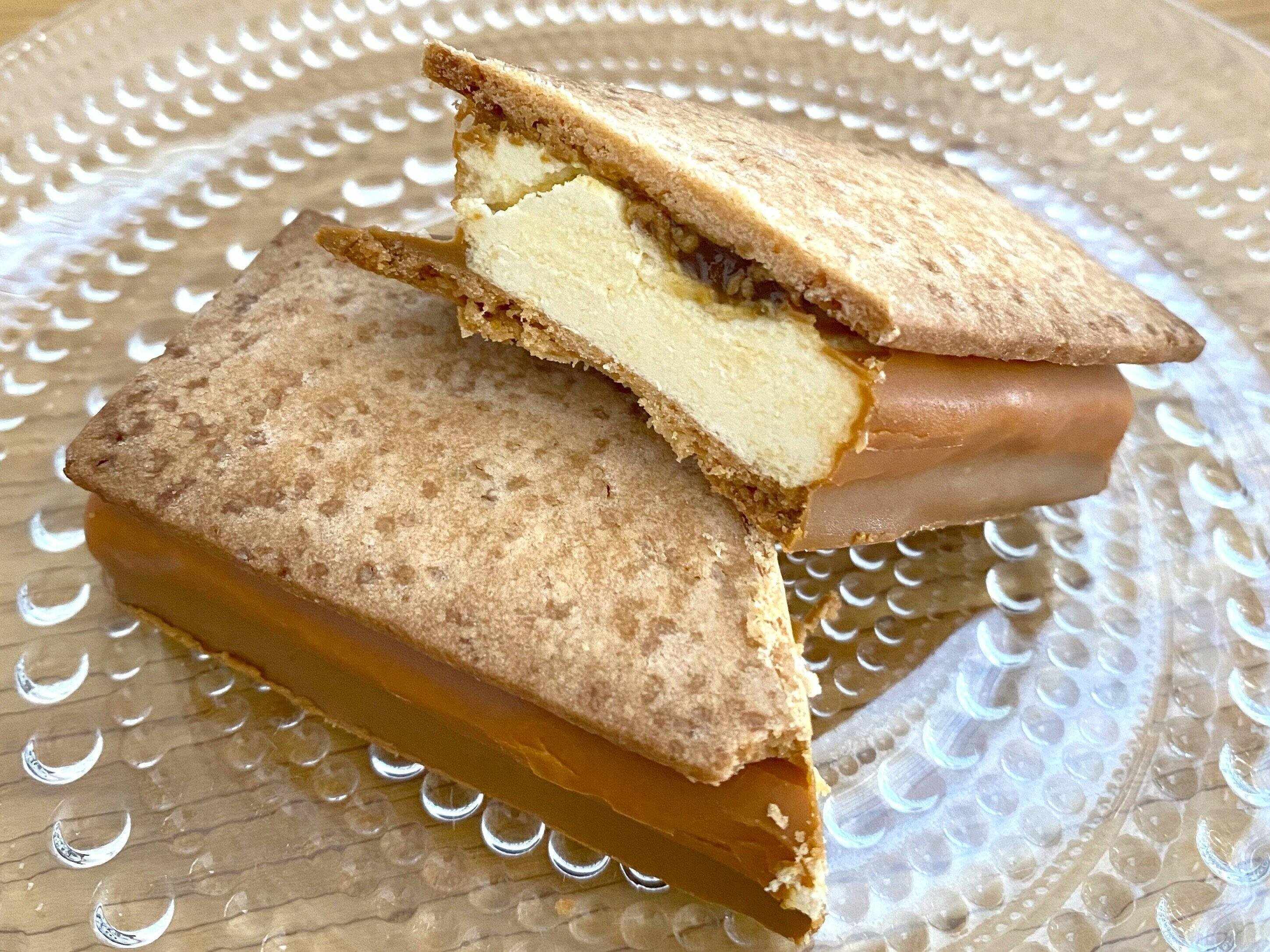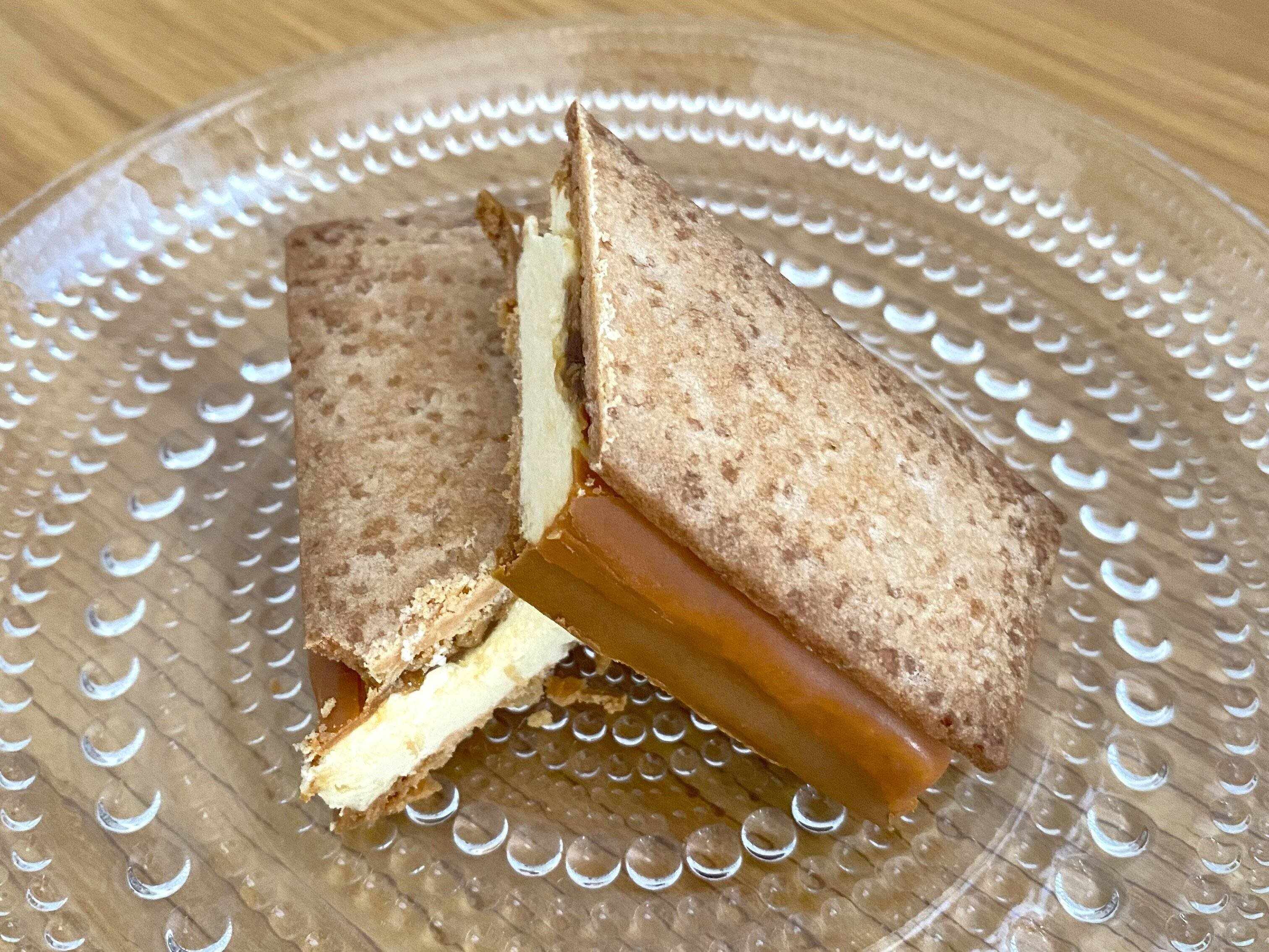ほろ苦いキャラメルソースが入ったキャラメルクリームをキャラメルチョコでコーティングし、2枚のビスケットでサンドしたスイーツです。