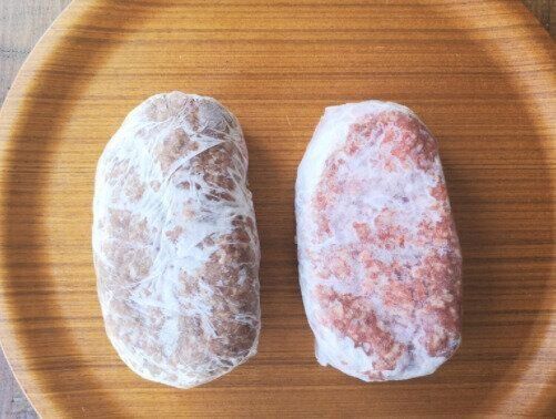 同じ時に購入したものを同じ期間冷凍したもので、どちらもしっかりと包んでいましたが、肉の色にこれだけ差が出ました!