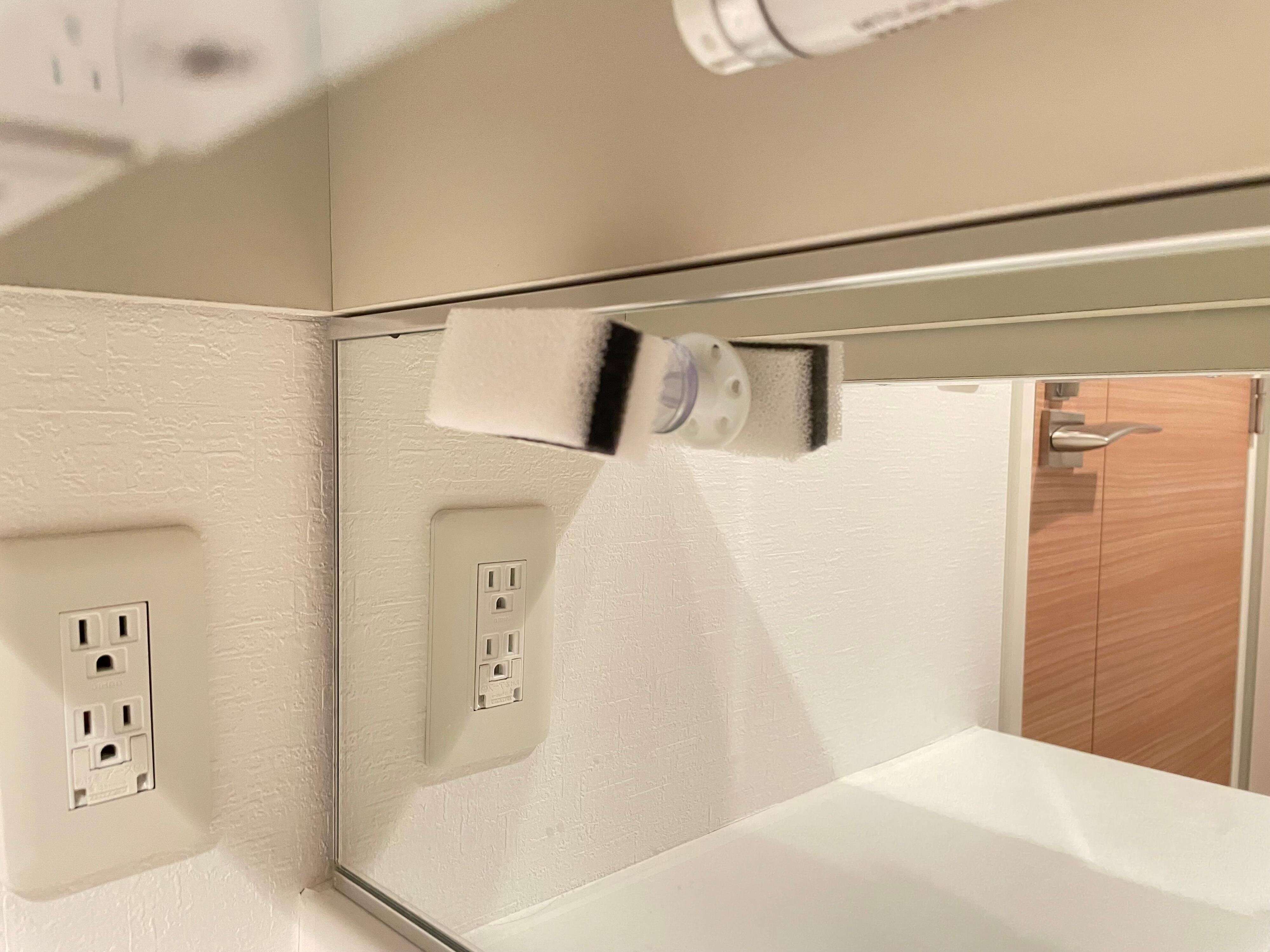 しゃがんだり、顔を洗うときは、スポンジがお目見えしますが、立っているとメインミラーの影に隠れて、姿が全く見えません!
