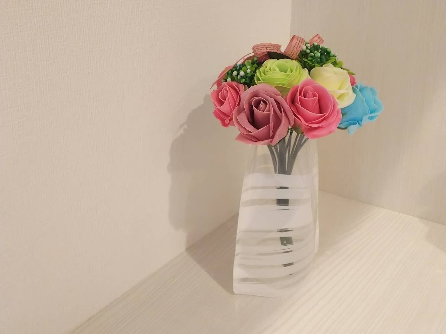 今回サイズが合うお花がなかったので、自己責任で上部をカットし、安定した場所に飾ってみましたが、ちょっと透明な感じがおしゃれです。なかなかガラスの花瓶では出せない雰囲気を出してくれています。