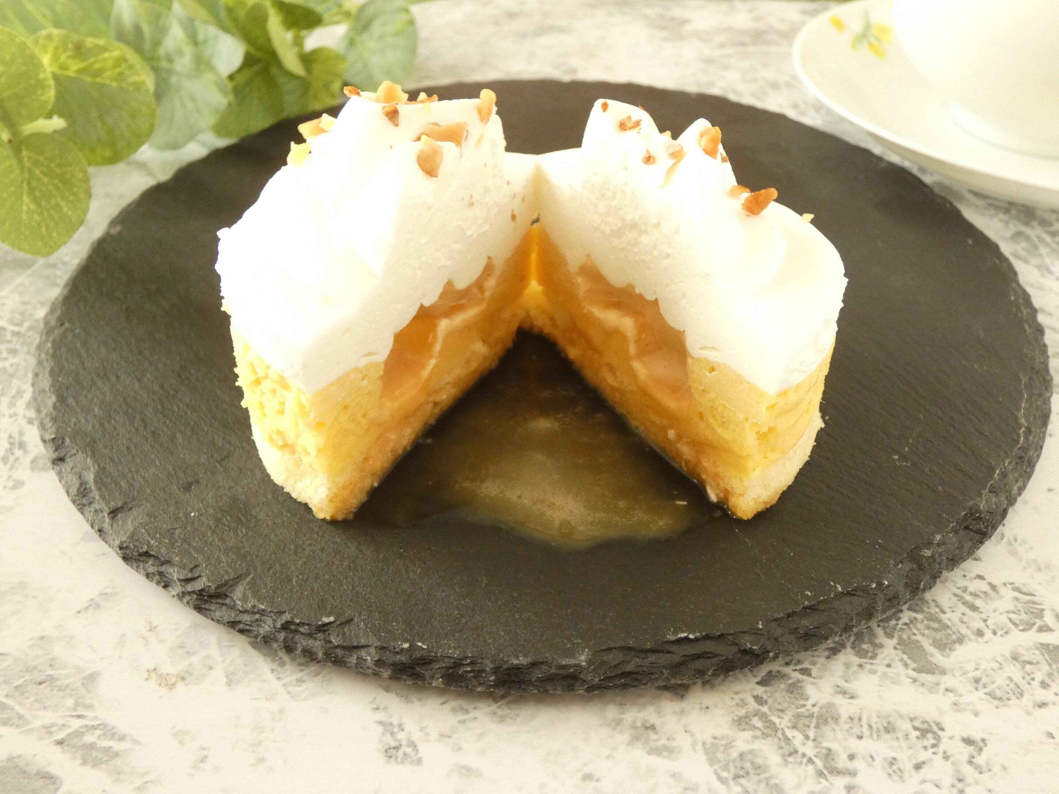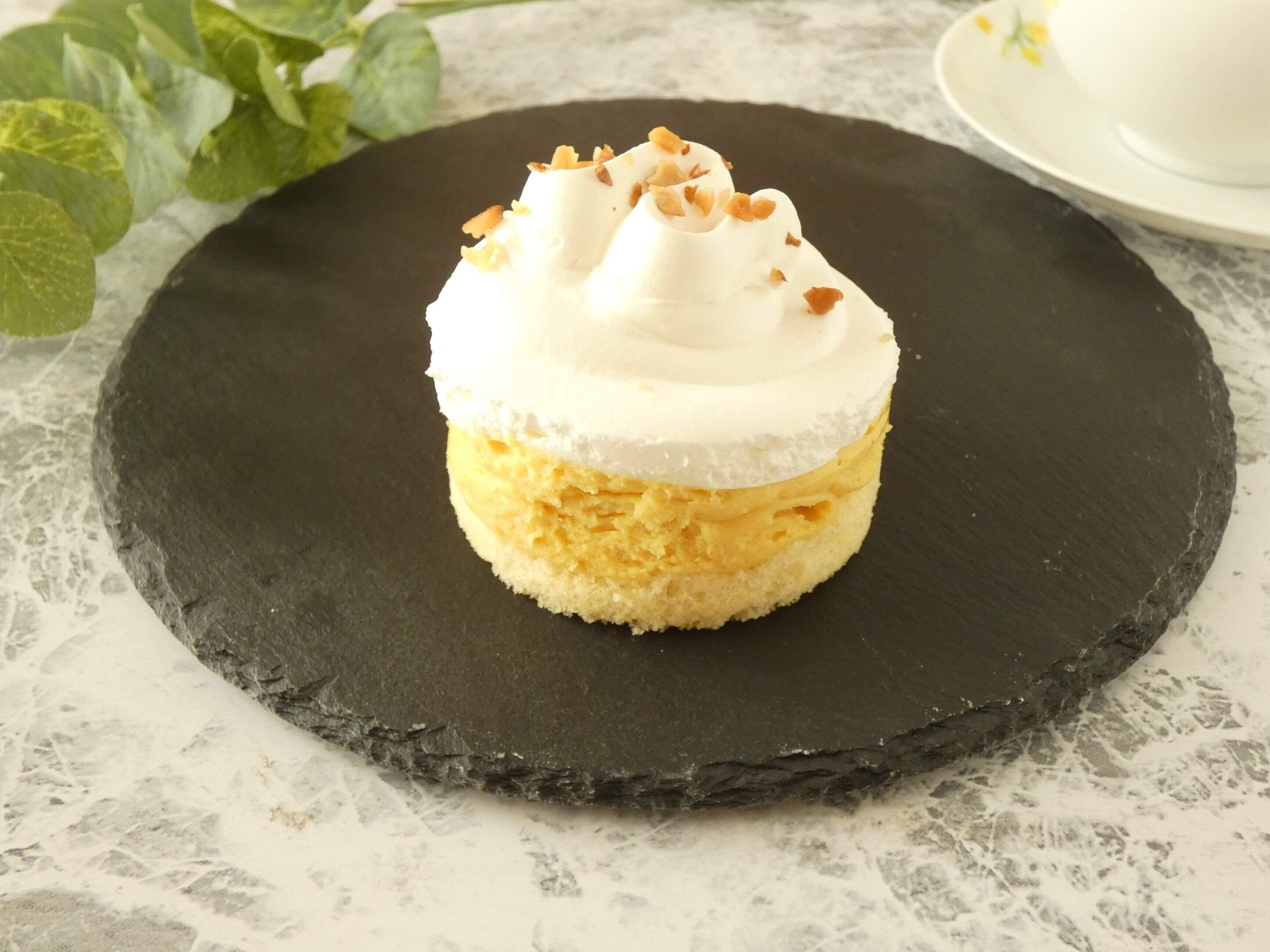 スポンジケーキに蜜芋や生クリームで仕立てた生スイートポテト、ホイップクリームがたっぷり重ねてあり、上にはアーモンドがトッピングしてあります。