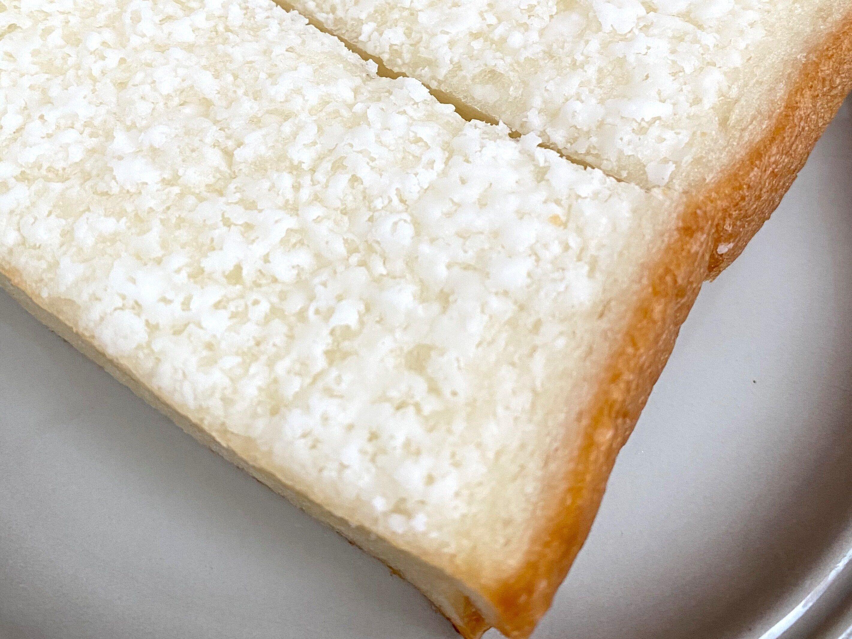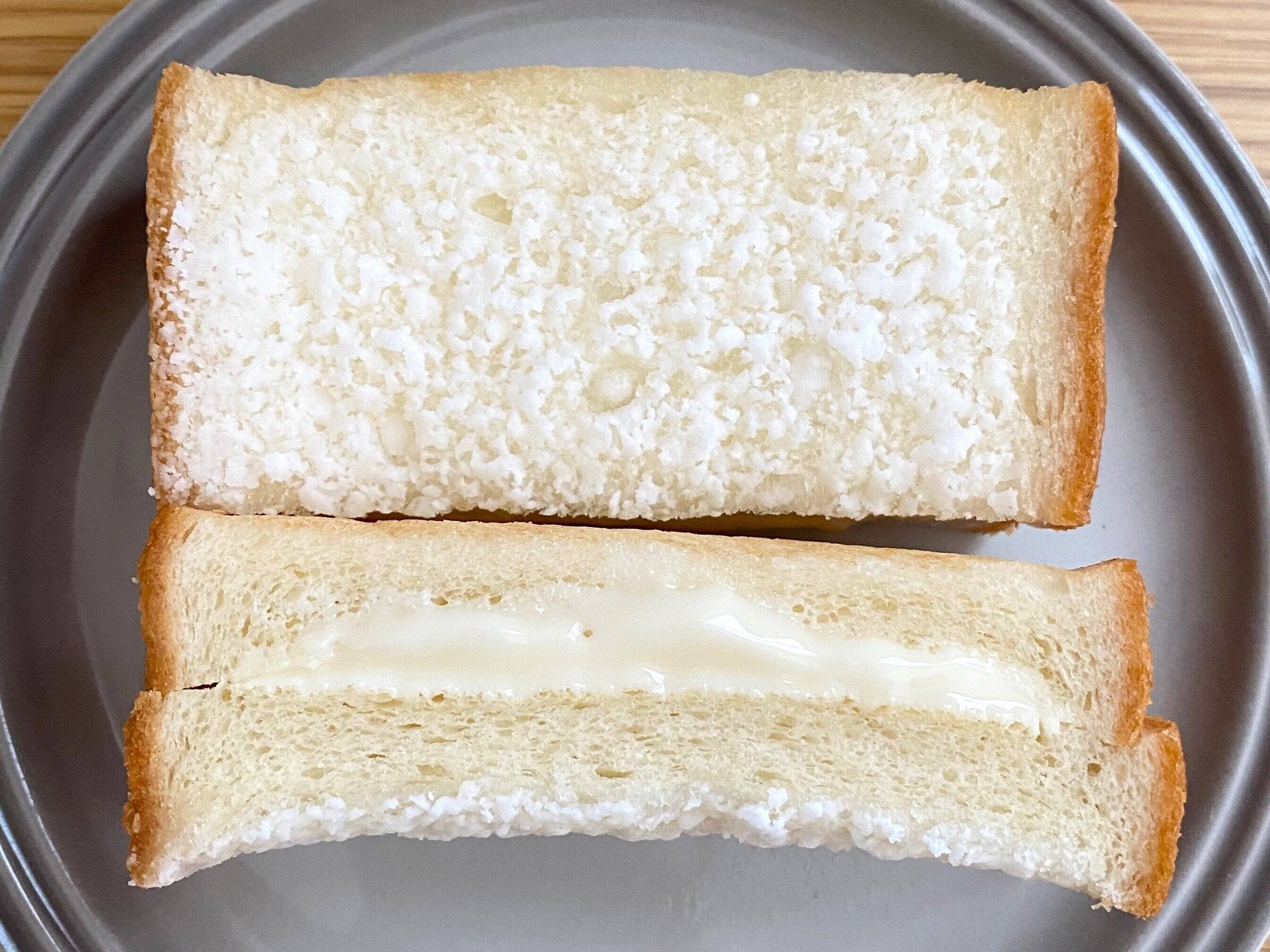 6枚切りの食パン2枚で塩バニラクリームがサンドされています。端のほうまでたっぷりとクリームが入っているところがうれしいです。上面には砂糖がトッピングされています。