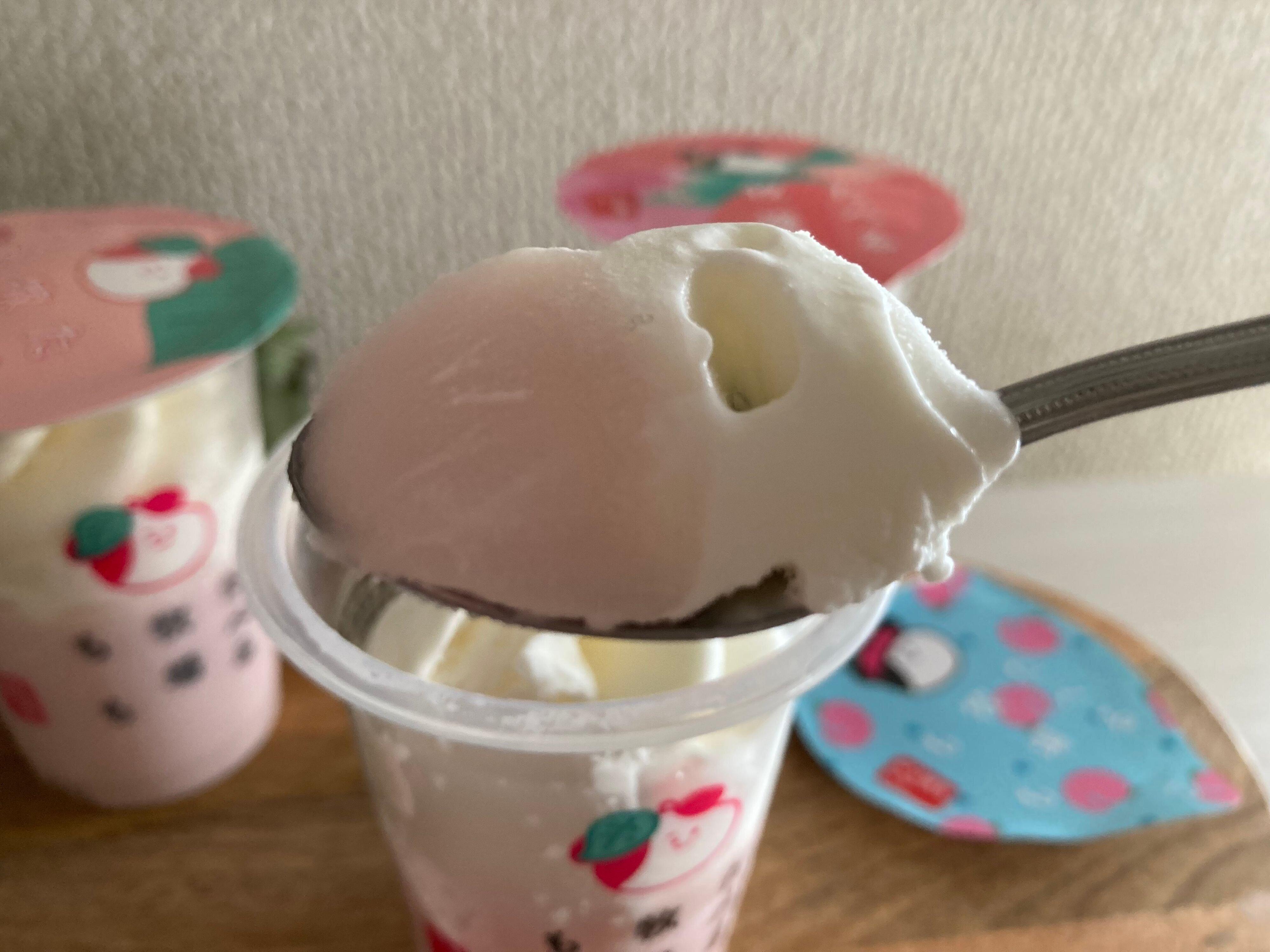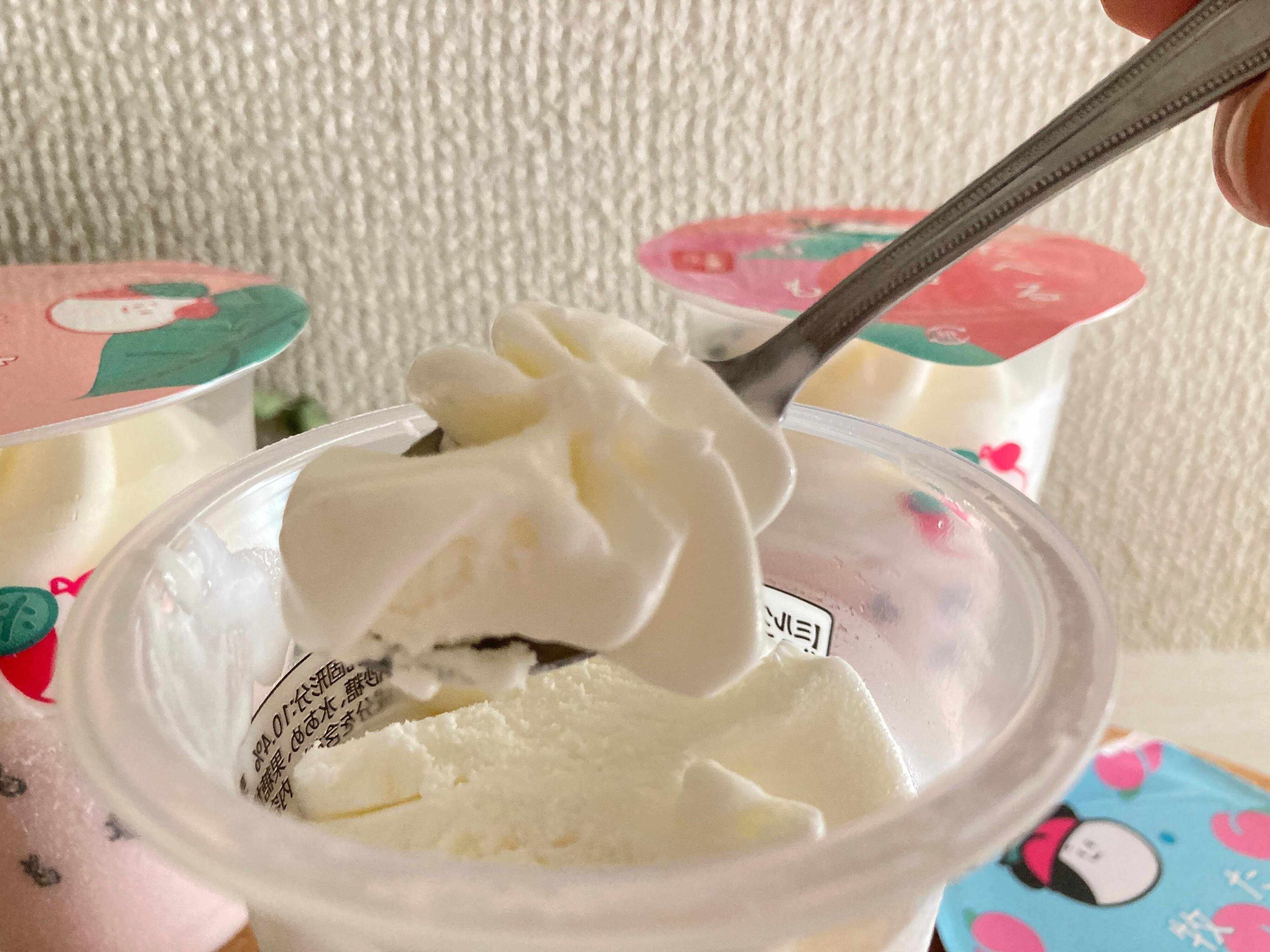 ミルクアイスを食べすすめると、ももジェラートが現れます。ももの味がしっかりと感じられ果肉が入っていて濃厚でジューシー!2種類のアイスを一緒に食べると絶妙なバランスでした。