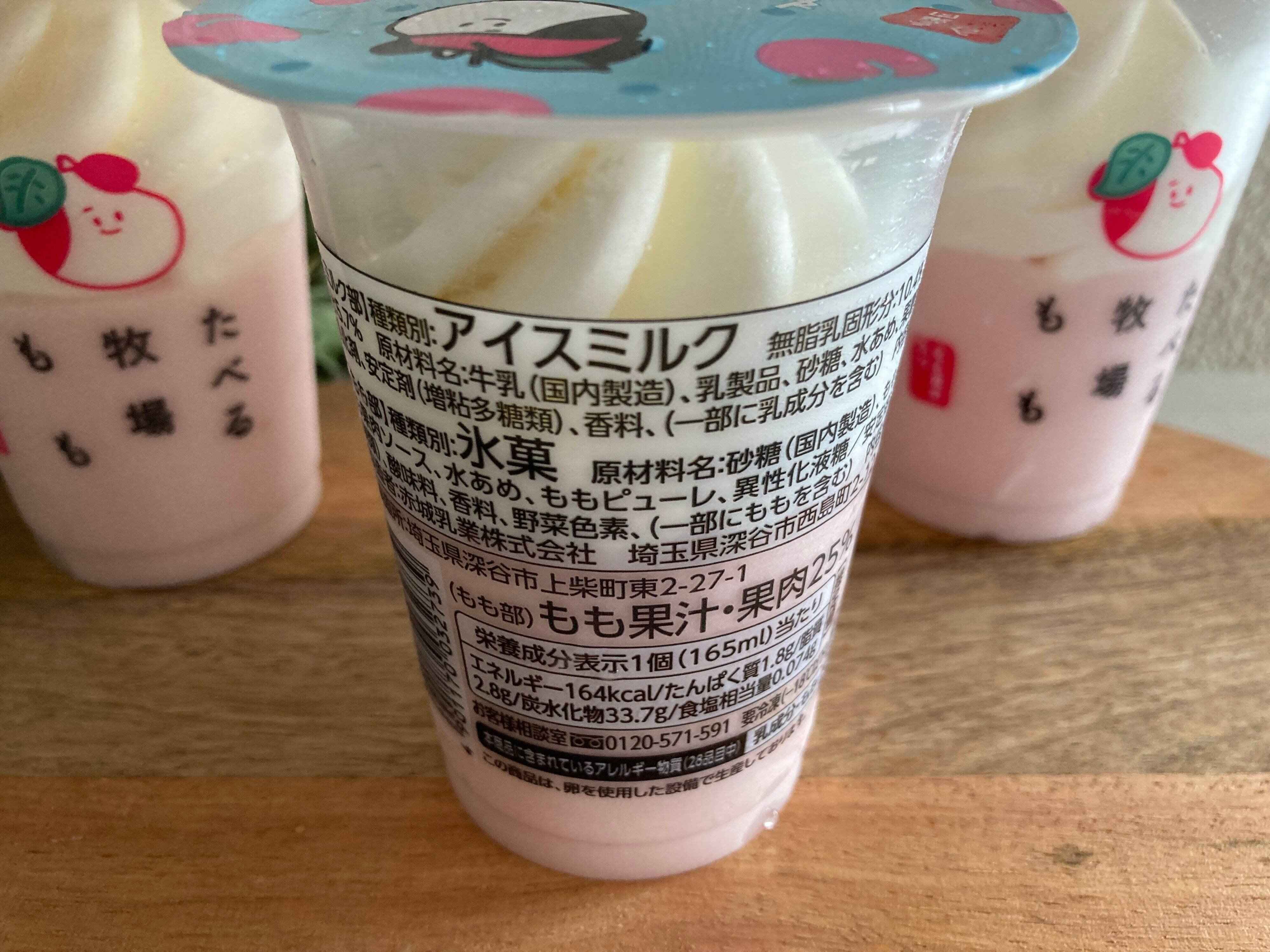上段は北海道産牛乳を56%使用したコクのあるミルクアイス、下段はもも果肉と白桃ピューレ入りのジェラートアイスで2層になっています。